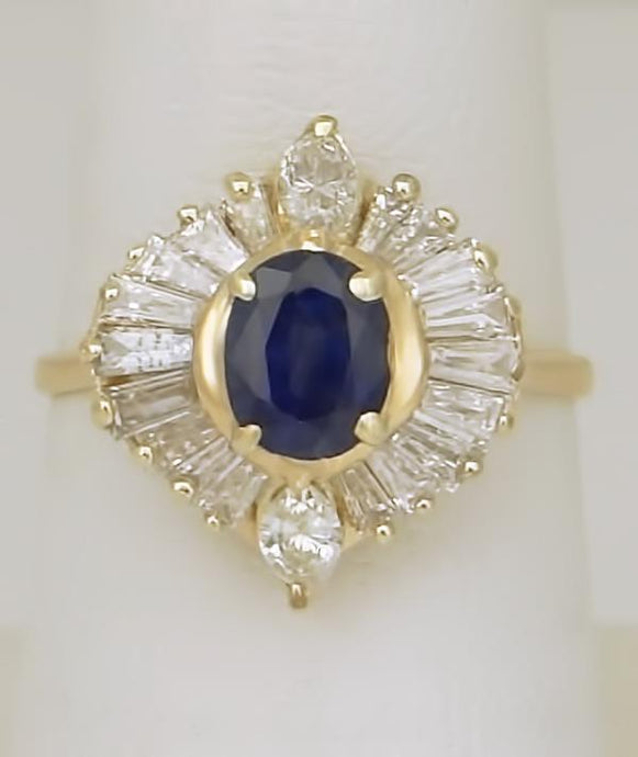 14k YELLOW GOLD 1.00ct OVAL BLUE SAPPHIRE 1.00ct BAGUETTE DIAMOND BALLERINA RING