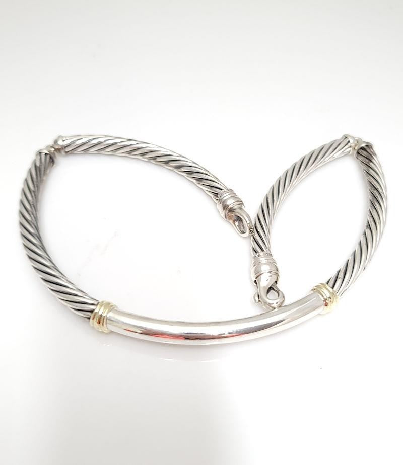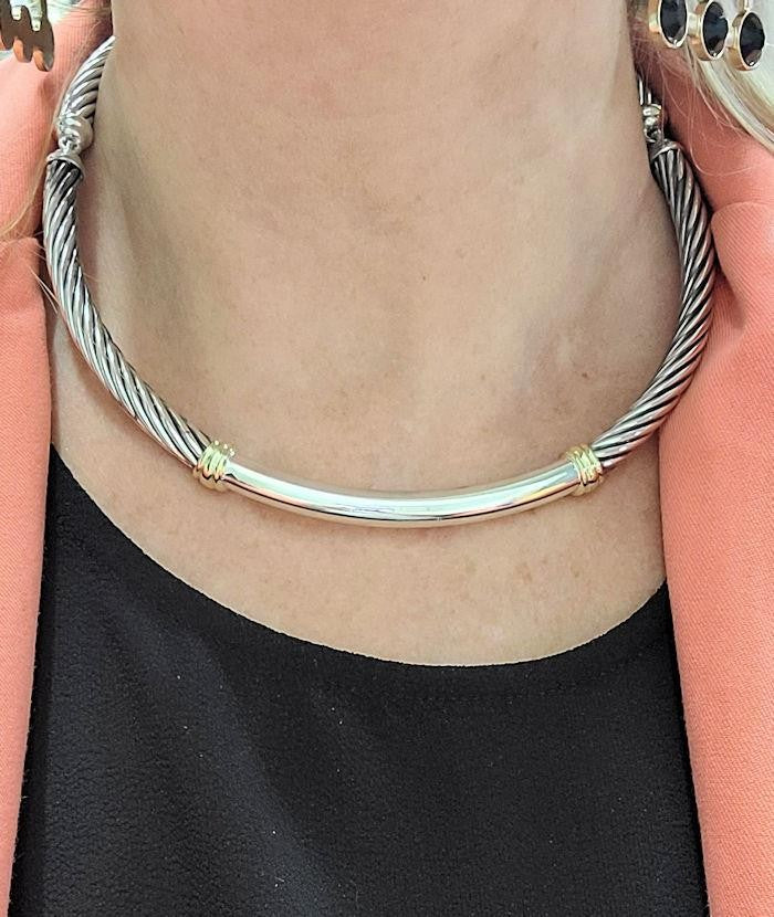 David Yurman sterling silver and 14k yellow gold cable choker featuring the iconic twisted cable design that has become synonymous with the brand. This timeless piece combines rich sterling silver with warm 14k yellow gold accents, creating a refined two tone look that is both bold and elegant.