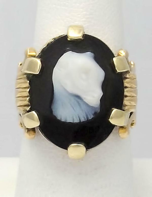 14k YELLOW GOLD CUSTOM MADE OVAL BLACK ONYX WHITE CARVED ANIMAL CAT RING