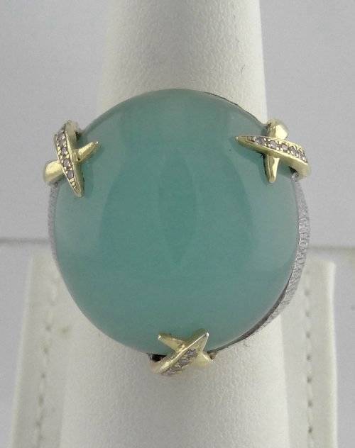 LADIES 925 18K YELLOW GOLD TEXTURED CABOCHON CHRYSOPRASE DIAMOND RING 7 3/4
