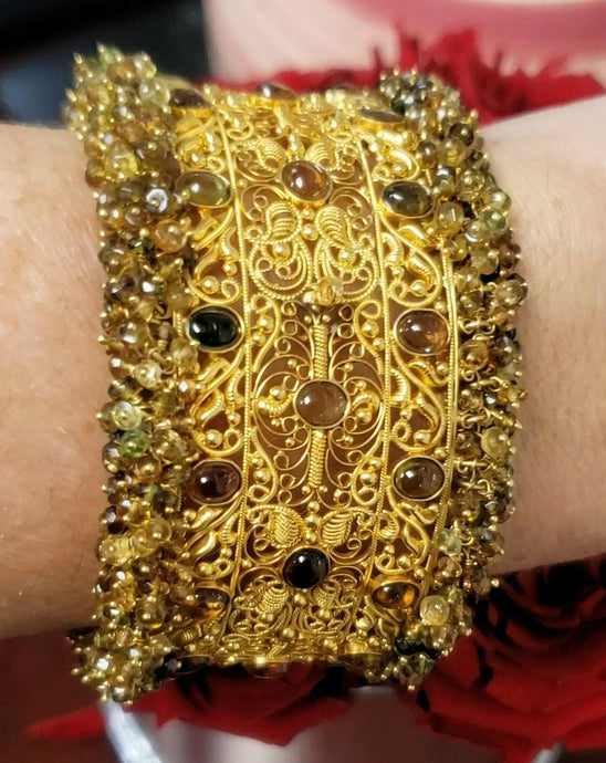 20k Yellow Gold Wide Filigree Cabachon Multi Gemstone Bangle Bracelet