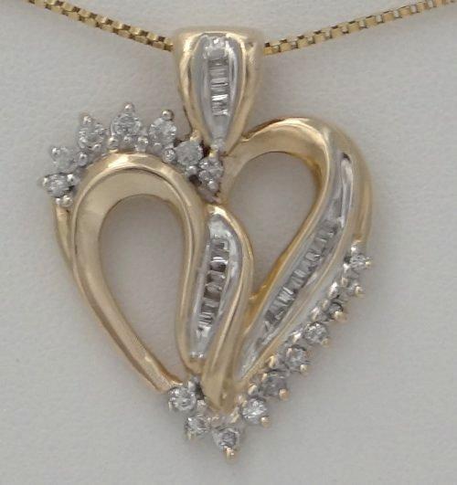LADIES 10K YELLOW GOLD 1/2ct ROUND BAGUETTE DIAMOND HEART LOVE PENDANT CHARM 1"