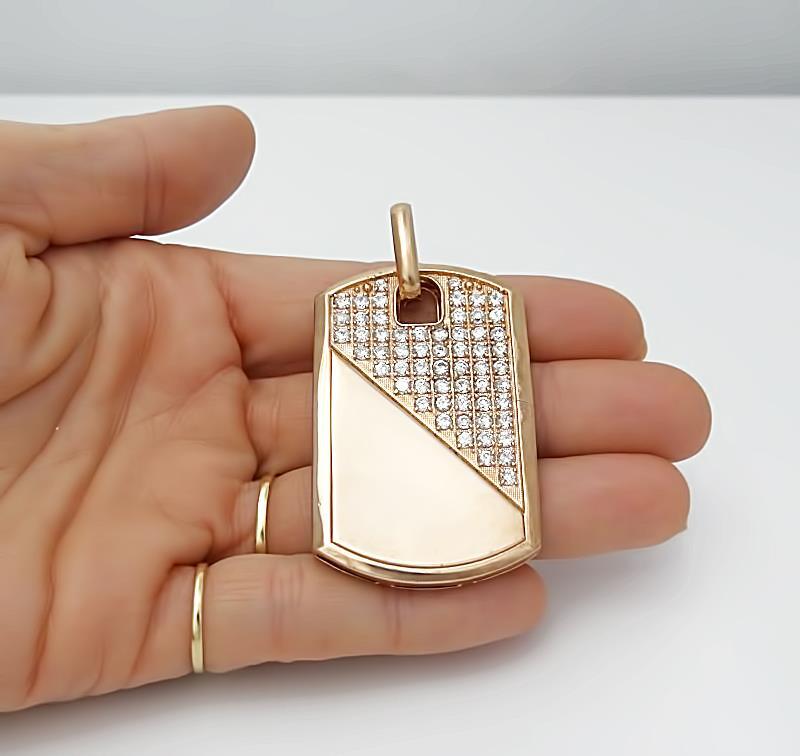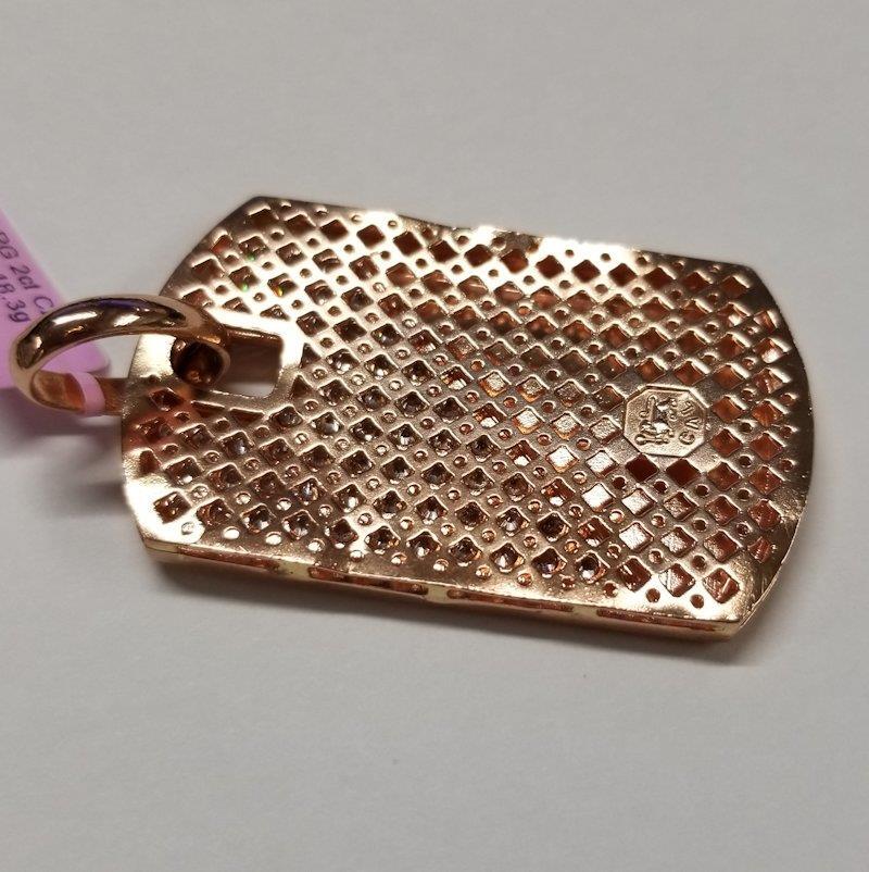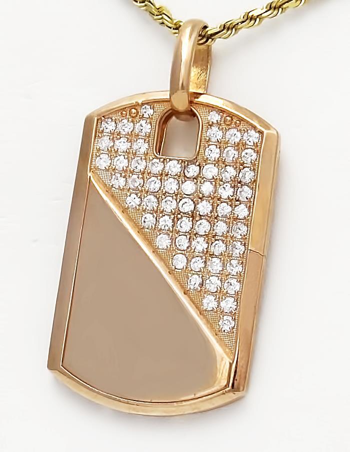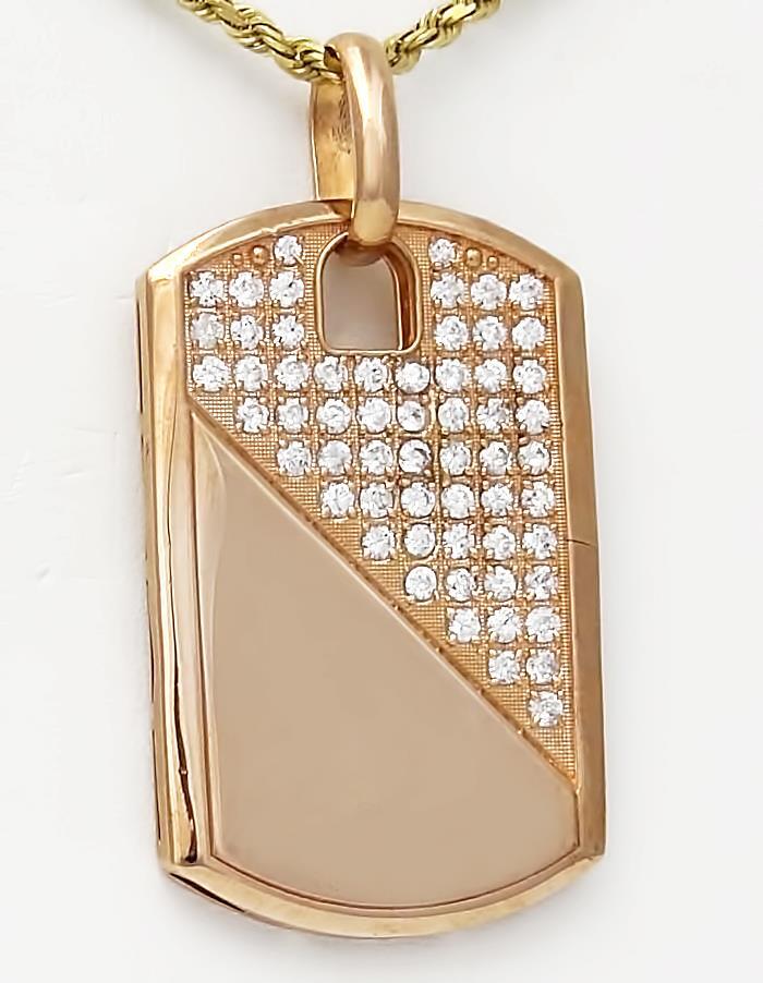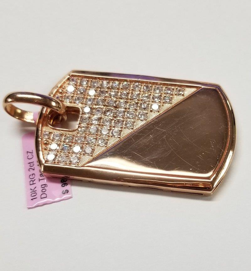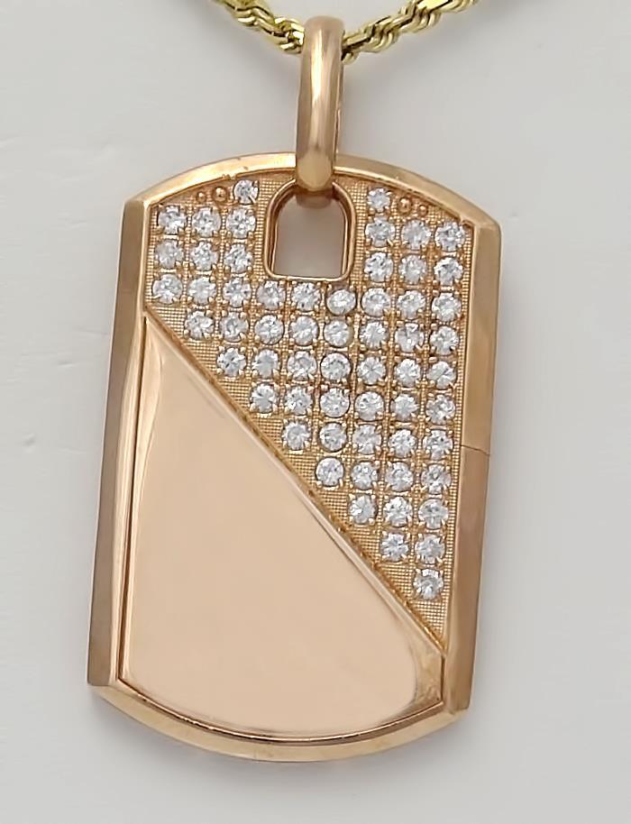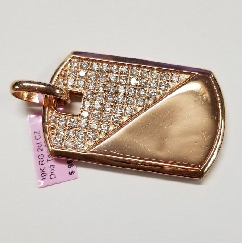 Introducing the Men's 10k Rose Gold 2.00ct Round Cubic Zirconia Gallery Back Dog Tag Pendant – a rugged testament to individuality with a story to tell. This unique pendant, weighing 18.3 grams, is not just an accessory; it's a distinctive statement of strength and character.