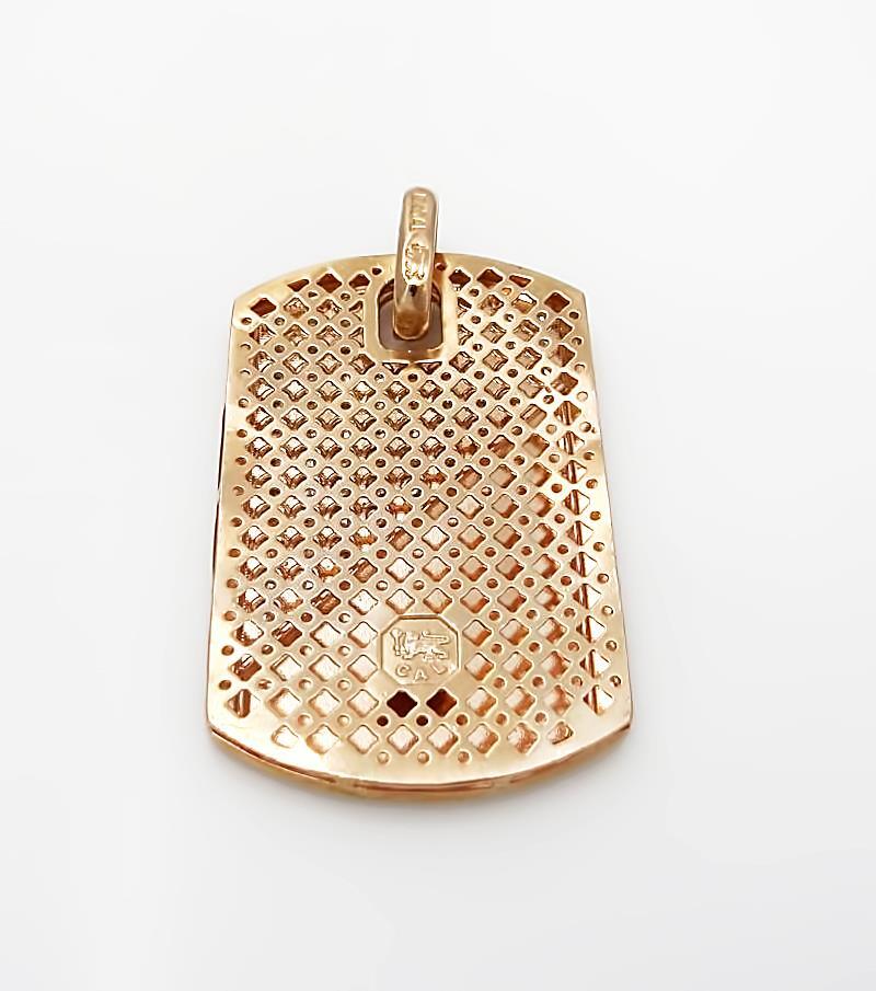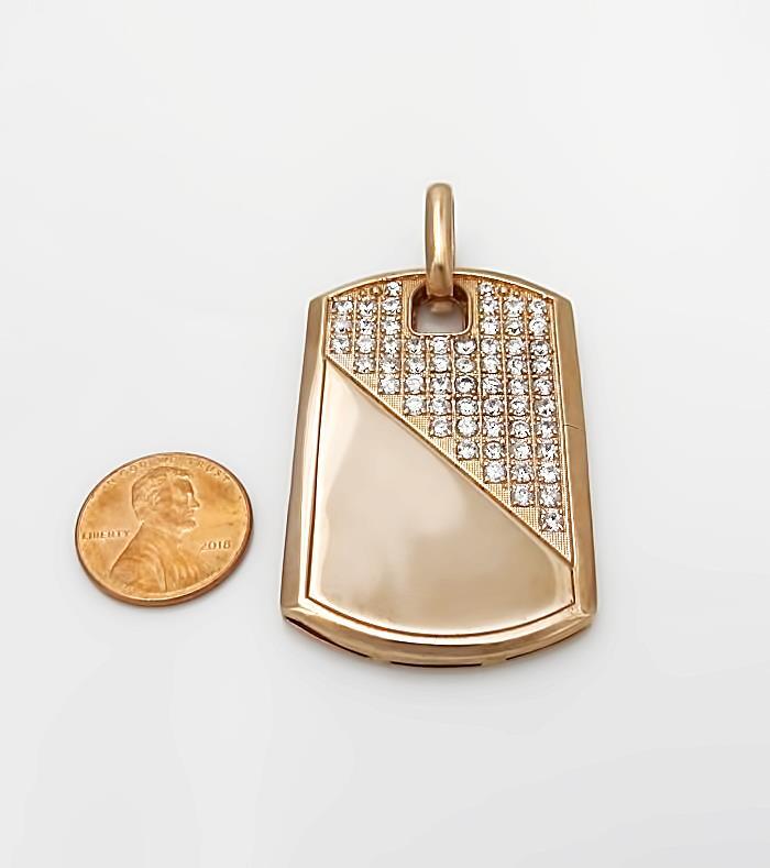 Adorned with 59 Round Cubic Zirconia stones totaling 2.00 carats, this pendant features a warm rose gold frame that complements its robust design. However, it proudly wears the marks of its journey – noticeable scratches and a dent on the front, adding a raw and authentic edge to its aesthetic.