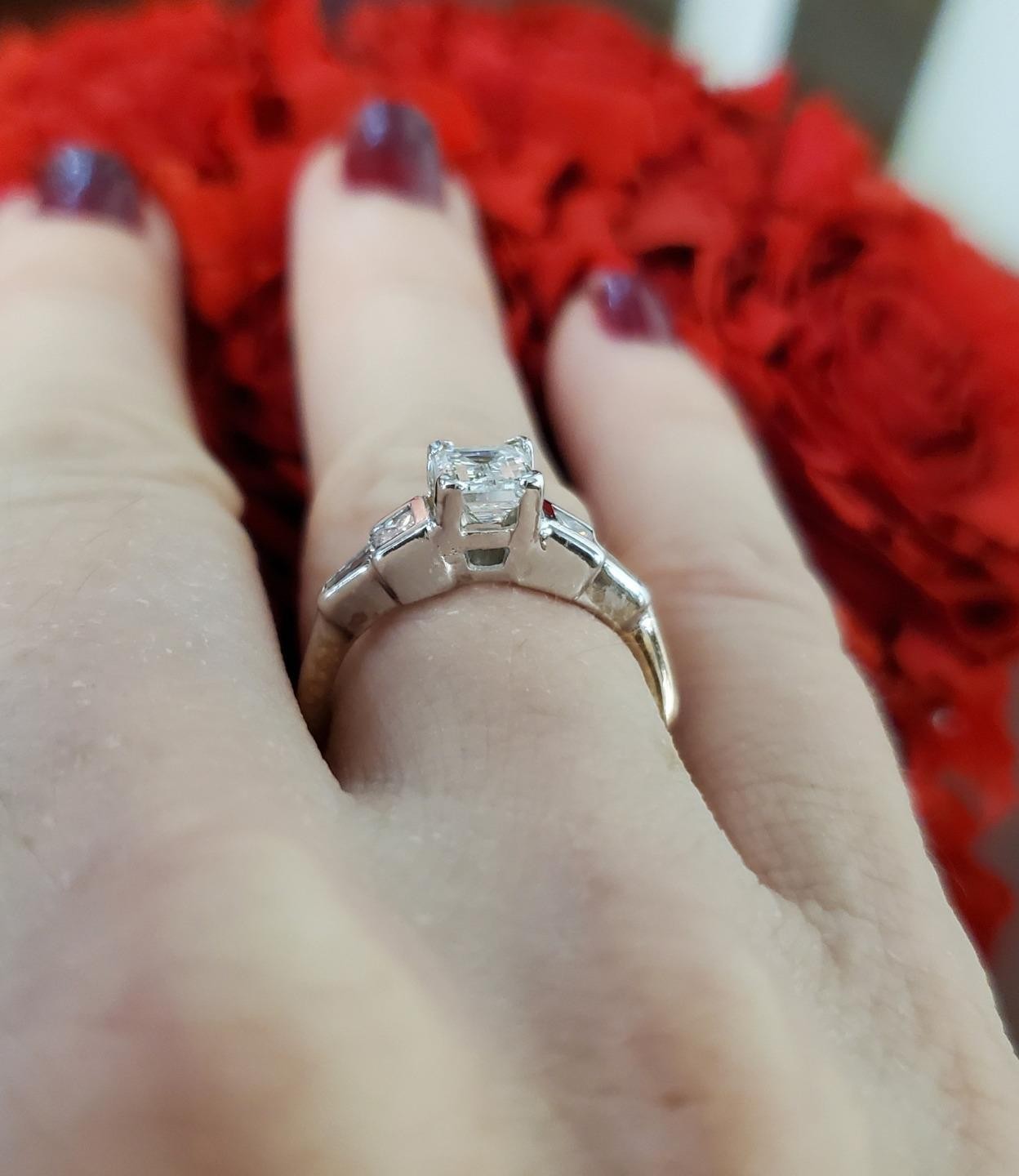 14k Two Tone Gold Emerald Princess Cut Baguette 1.96ct Diamond Engagement Ring. This elegant and uniquely designed ring features a blend of white and yellow 14k gold, creating a beautiful two tone look that enhances the brilliance of the diamonds.