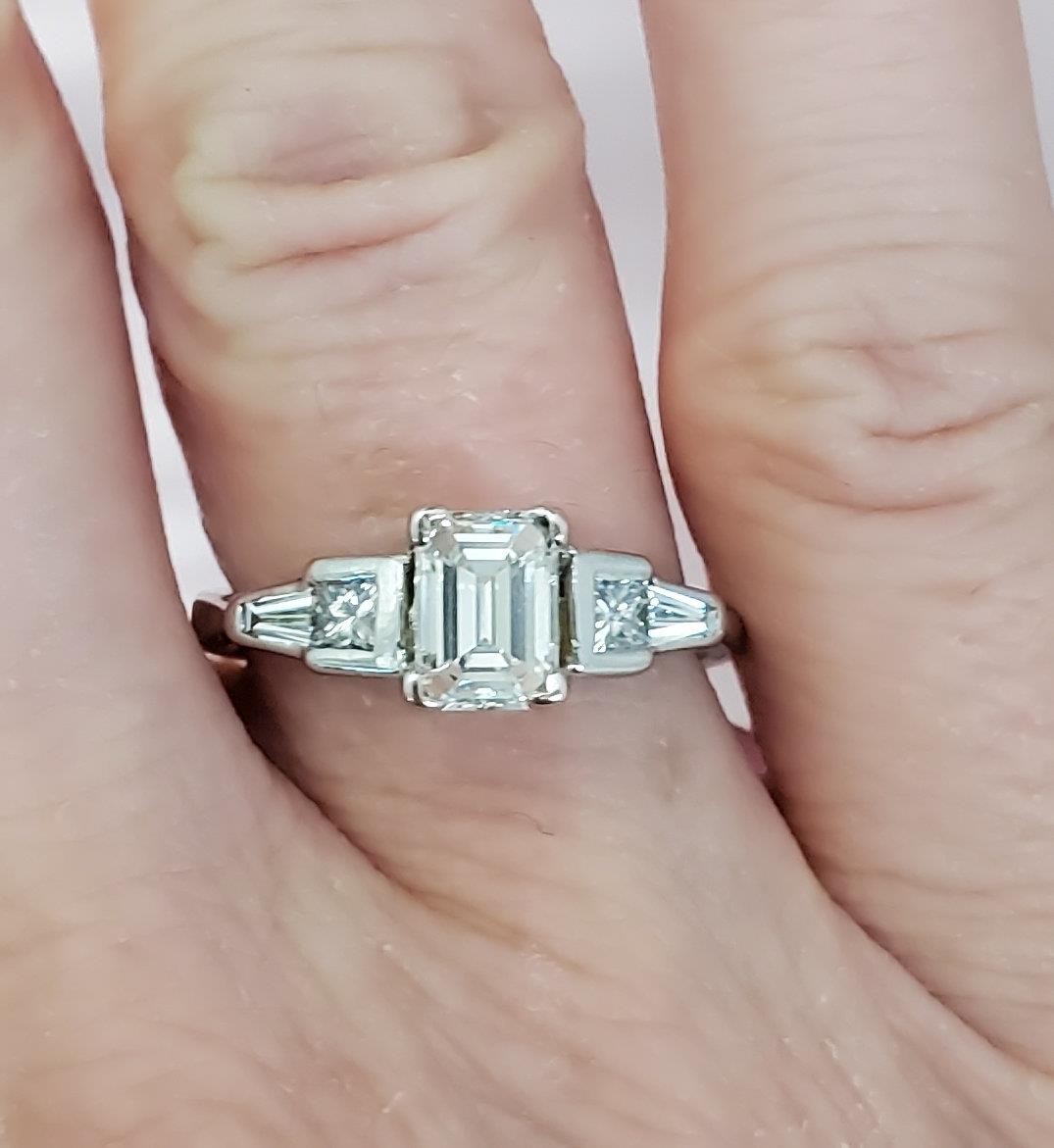 The centerpiece is a stunning .86ct emerald cut natural genuine diamond, offering exceptional clarity and a sophisticated, elongated sparkle. Framing the center stone are two princess cut natural diamonds and two baguette natural diamonds, adding up to an estimated 1.10ct in accent stones. Together, the total estimated carat weight is 1.96ct.