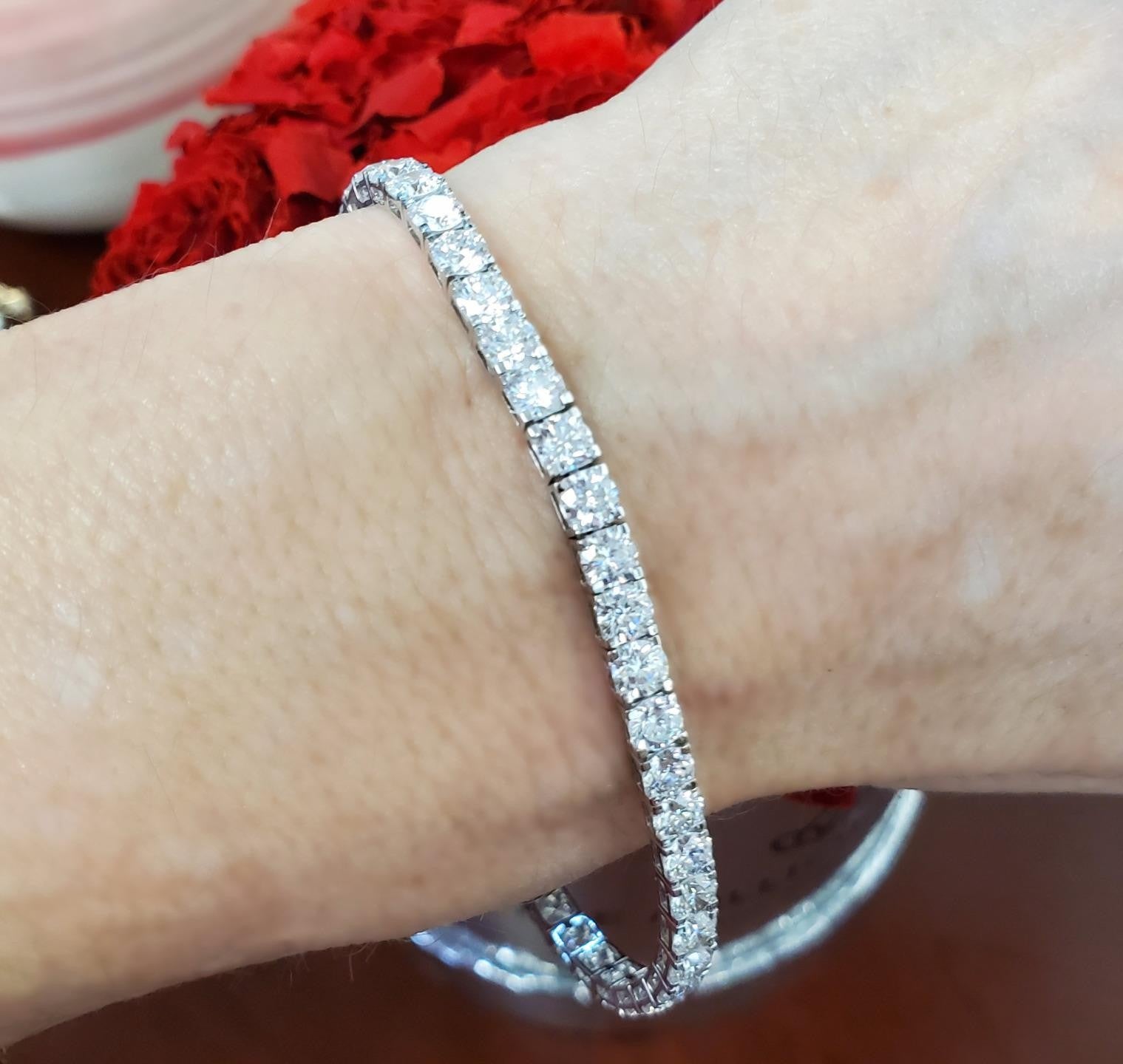 This elegant tennis eternity bracelet is crafted in solid 14k white gold and set with 10.00 total carats of lab grown diamonds, offering exceptional brilliance in a refined, wearable design. Each diamond is precision cut and carefully matched for consistency, creating a continuous line of sparkle around the wrist in classic eternity style. The diamonds are graded VS2 in clarity with a bright F–G color range, delivering outstanding fire, brilliance, and a near colorless appearance.