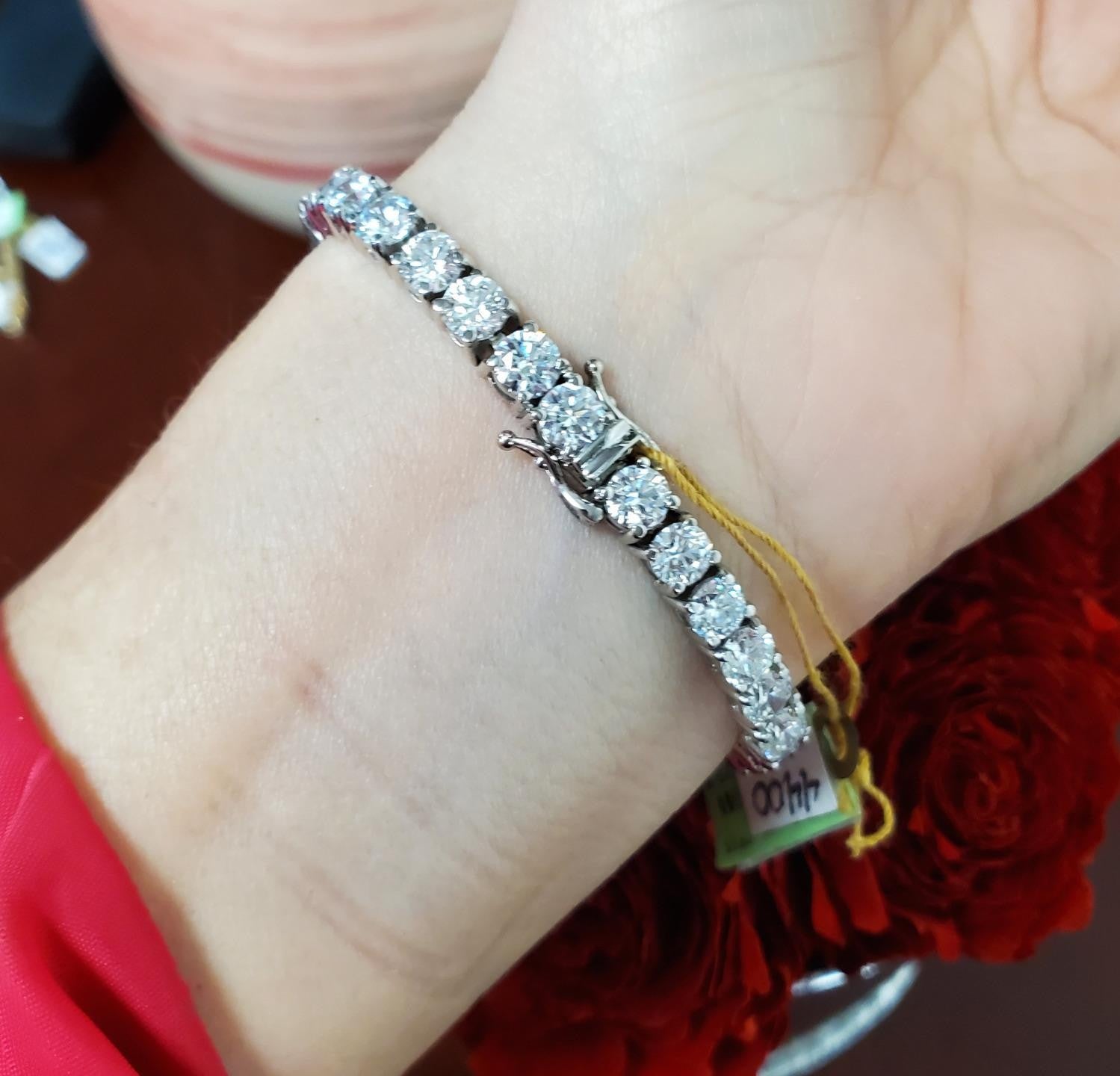 This exceptional eternity tennis bracelet is crafted in solid 14k white gold and set with an impressive 16.00 total carats of lab grown diamonds, delivering extraordinary brilliance and presence on the wrist. Each diamond is precision cut and carefully matched to create a seamless, continuous line of sparkle that wraps fully around the wrist in classic eternity style. The diamonds are graded VS2 in clarity with a bright F–G color range, offering outstanding fire, brilliance, and a crisp near-colorless appearance comparable to fine natural diamonds.