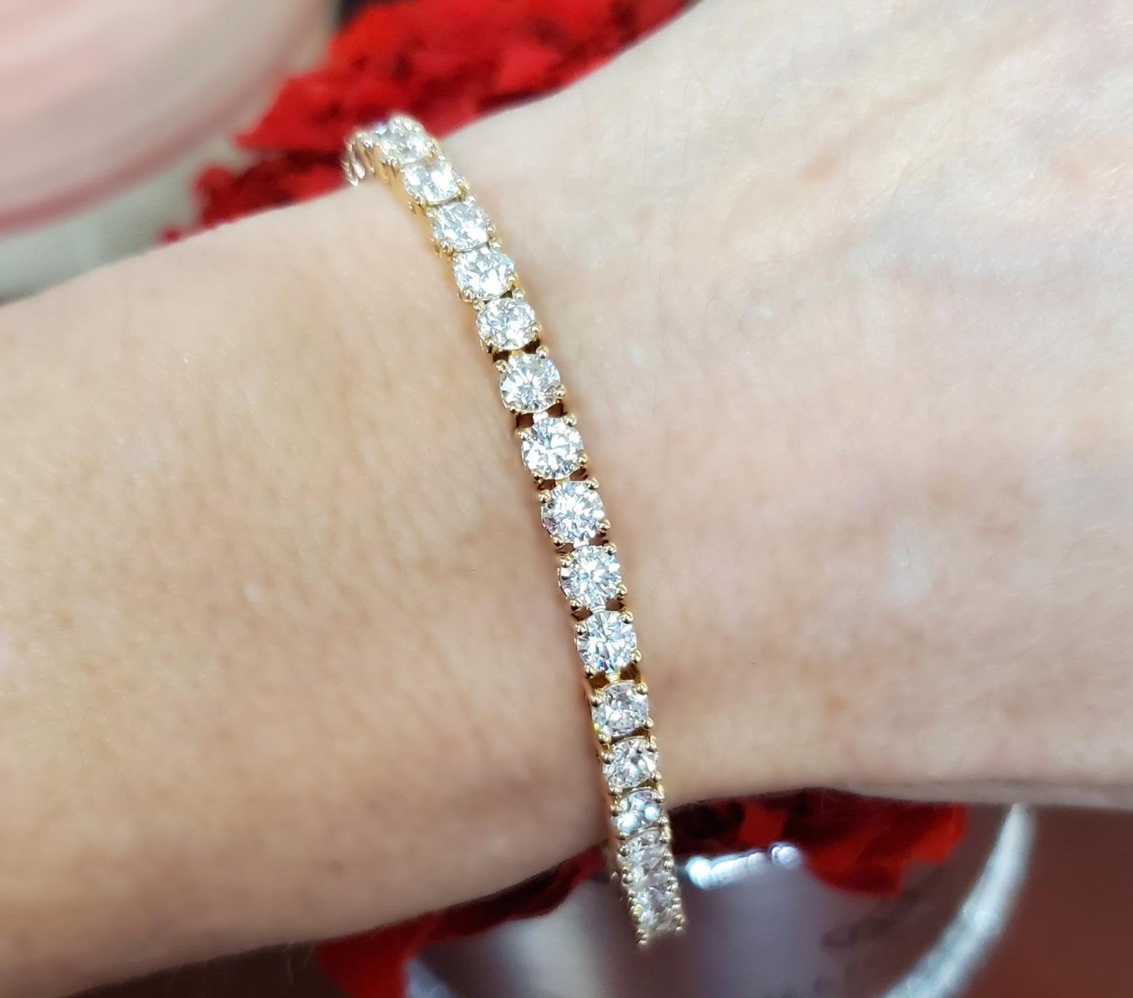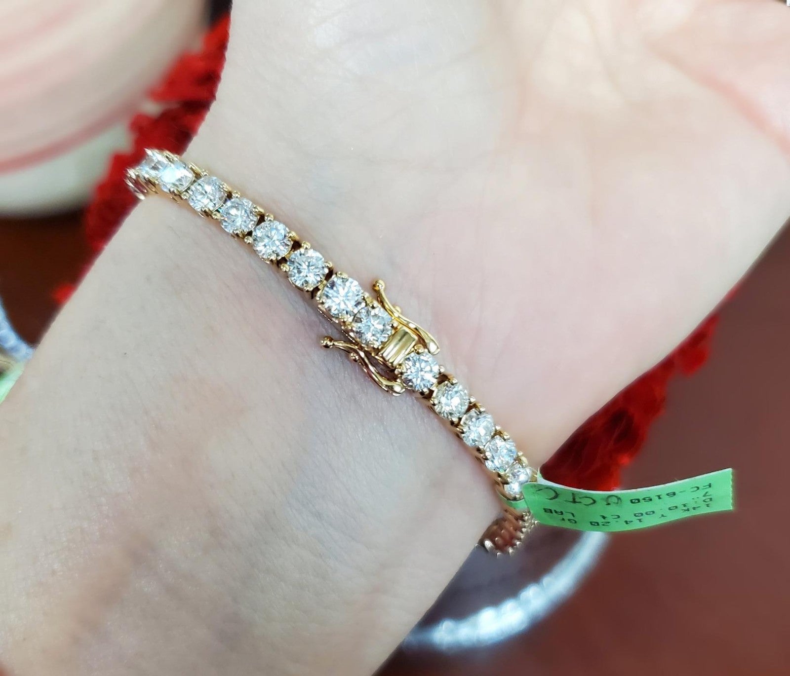 This stunning tennis eternity bracelet is crafted in solid 14k yellow gold and set with an impressive 10.00 total carats of lab grown diamonds, offering bold brilliance with classic warmth. The rich tone of yellow gold beautifully enhances the diamonds, creating a timeless and eye-catching look that stands out on the wrist.
