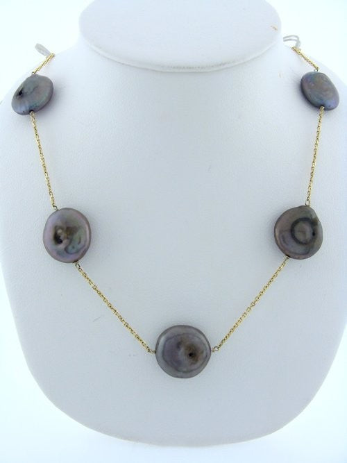 Elegant 14k Yellow Gold Black Pearl Tin Cup Necklace featuring seven unique round flat pearls measuring approximately 12–13mm each. The pearls display rich black tones with subtle overtones of green and purple, offering a captivating luster and a one-of-a-kind look. Each pearl is beautifully spaced along a delicate 1mm yellow gold chain, creating a refined and timeless design.
