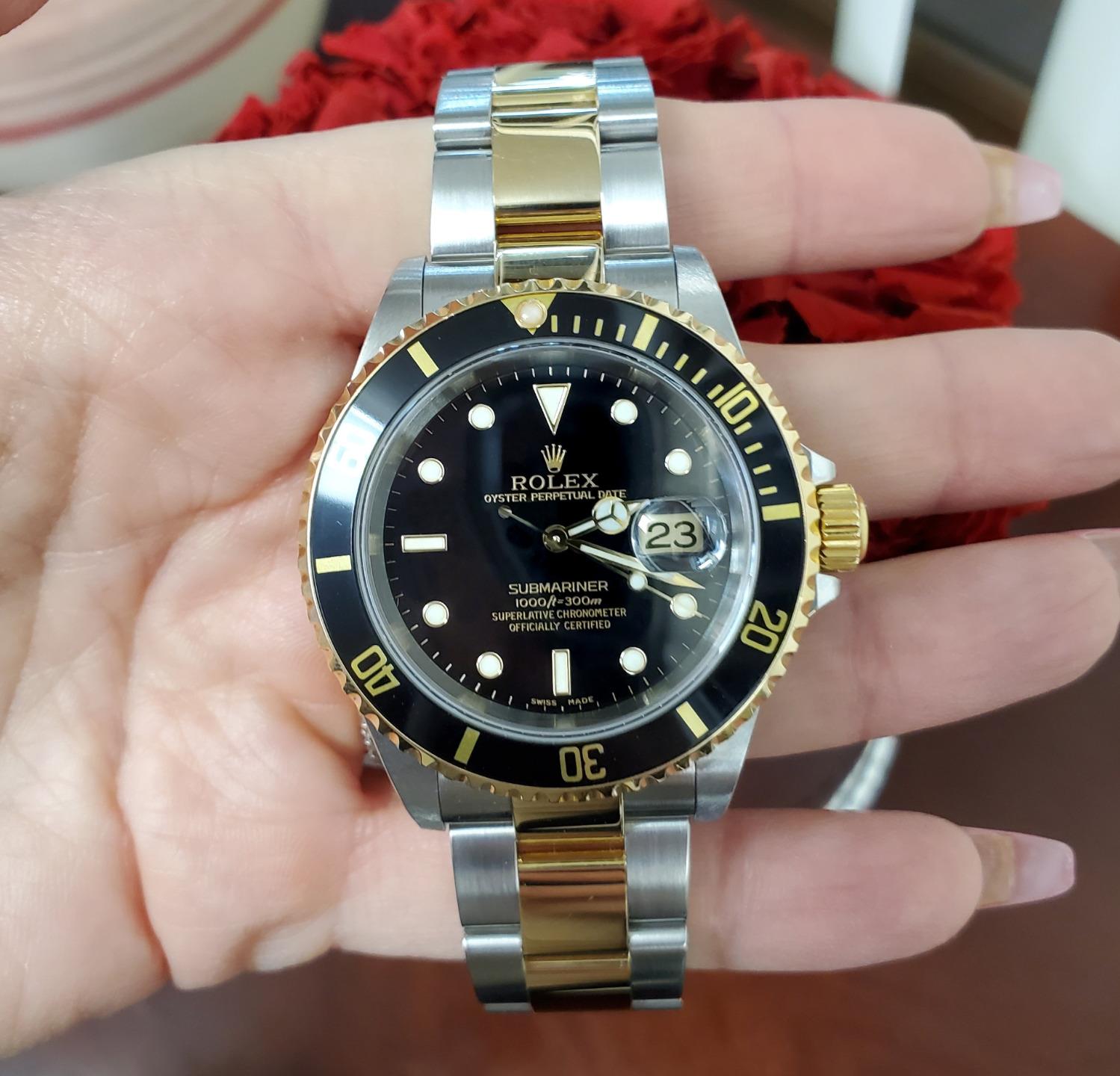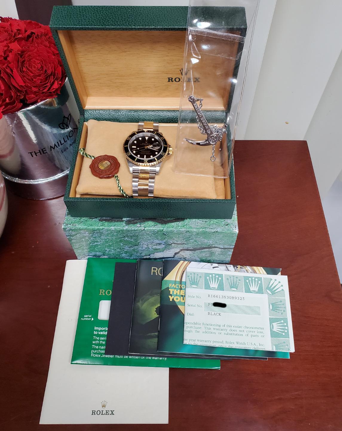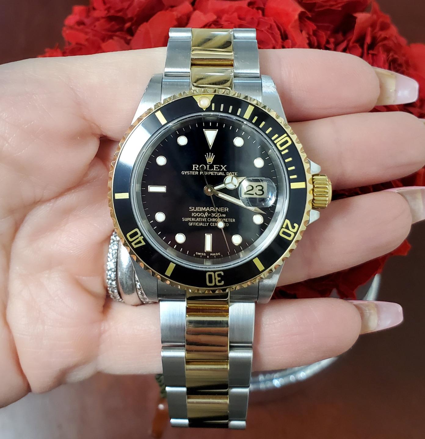This Rolex Submariner reference 16613 features the iconic two-tone construction of stainless steel and 18k yellow gold, paired with a black dial and matching black bezel for a timeless and instantly recognizable look. The 40mm case is fitted with a scratch-resistant sapphire crystal and powered by Rolex’s automatic self-winding movement, delivering the reliability and performance the Submariner line is known for. The dial features luminous hour markers and hands for excellent legibility in all conditions.