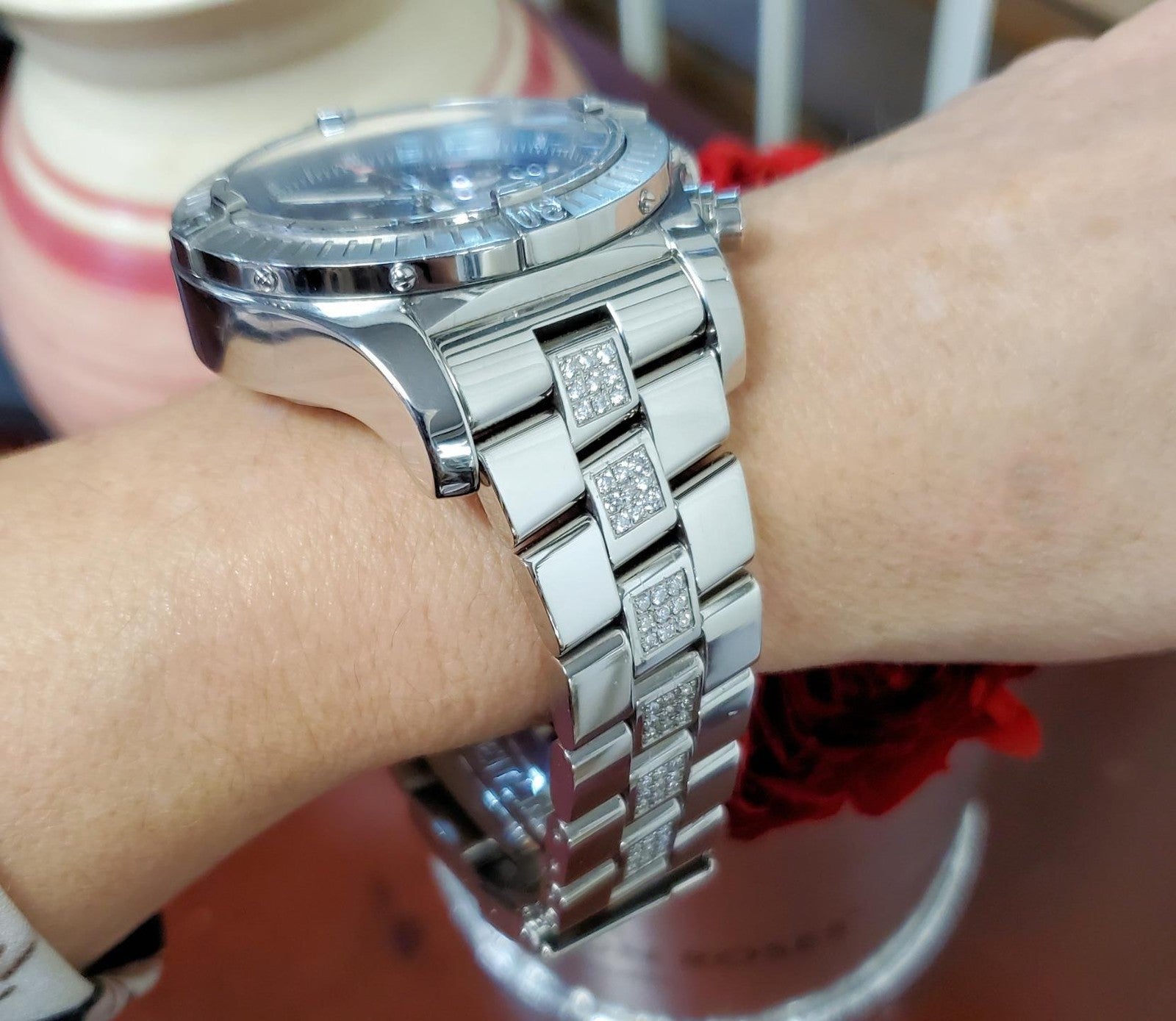 The stainless steel band further elevates the look, featuring custom diamonds down the center links for a striking, luxurious touch. Measuring 8 3/4" in length, the bracelet offers a secure and comfortable fit for a variety of wrist sizes. The combination of stainless steel and diamond-accented links creates a bold, eye-catching aesthetic.