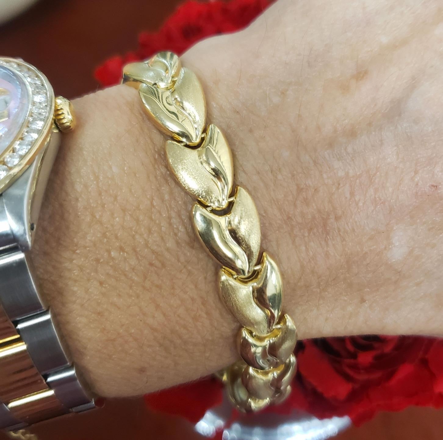 This ladies’ 14k Italian yellow gold hollow heart shape link bracelet offers a perfect blend of delicate design and expert craftsmanship. The bracelet is composed of a series of interconnected hollow heart-shaped links, each measuring 10.5mm wide, which creates a bold yet elegant statement on the wrist. The hollow design ensures the bracelet maintains a lightweight feel despite its substantial width, making it comfortable to wear throughout the day.