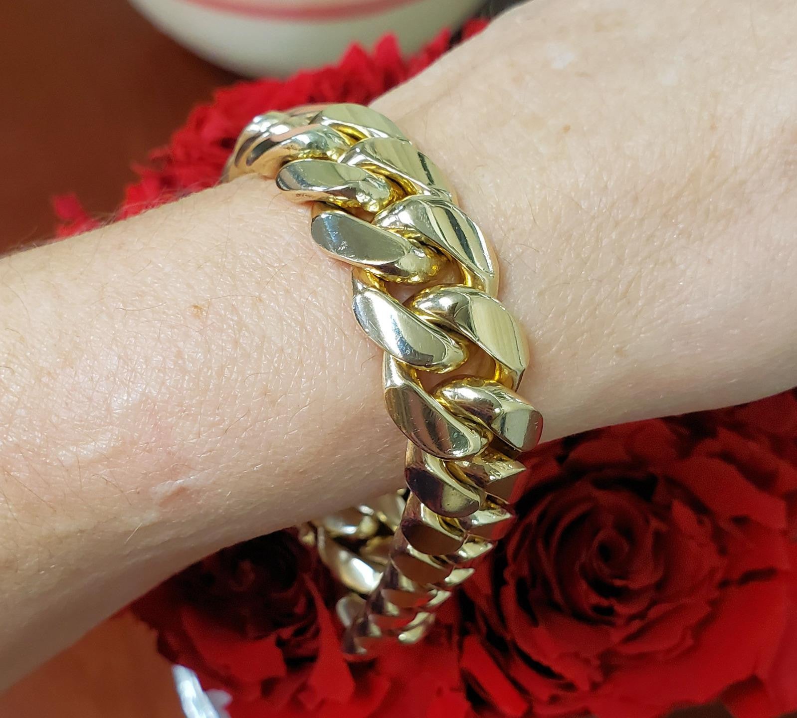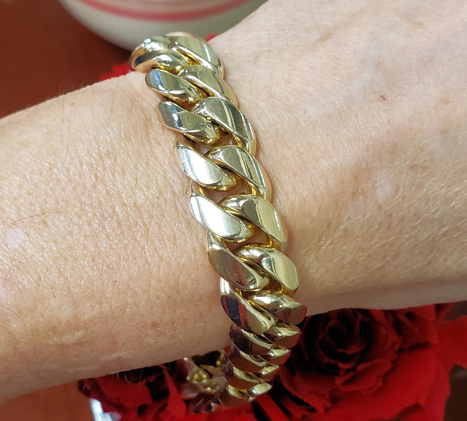 Weighing an impressive 126.6 grams, this bracelet is hallmarked 14k, ensuring enduring quality and durability. The closed solid link design adds to its robustness, while the gleaming gold finish radiates elegance and sophistication.