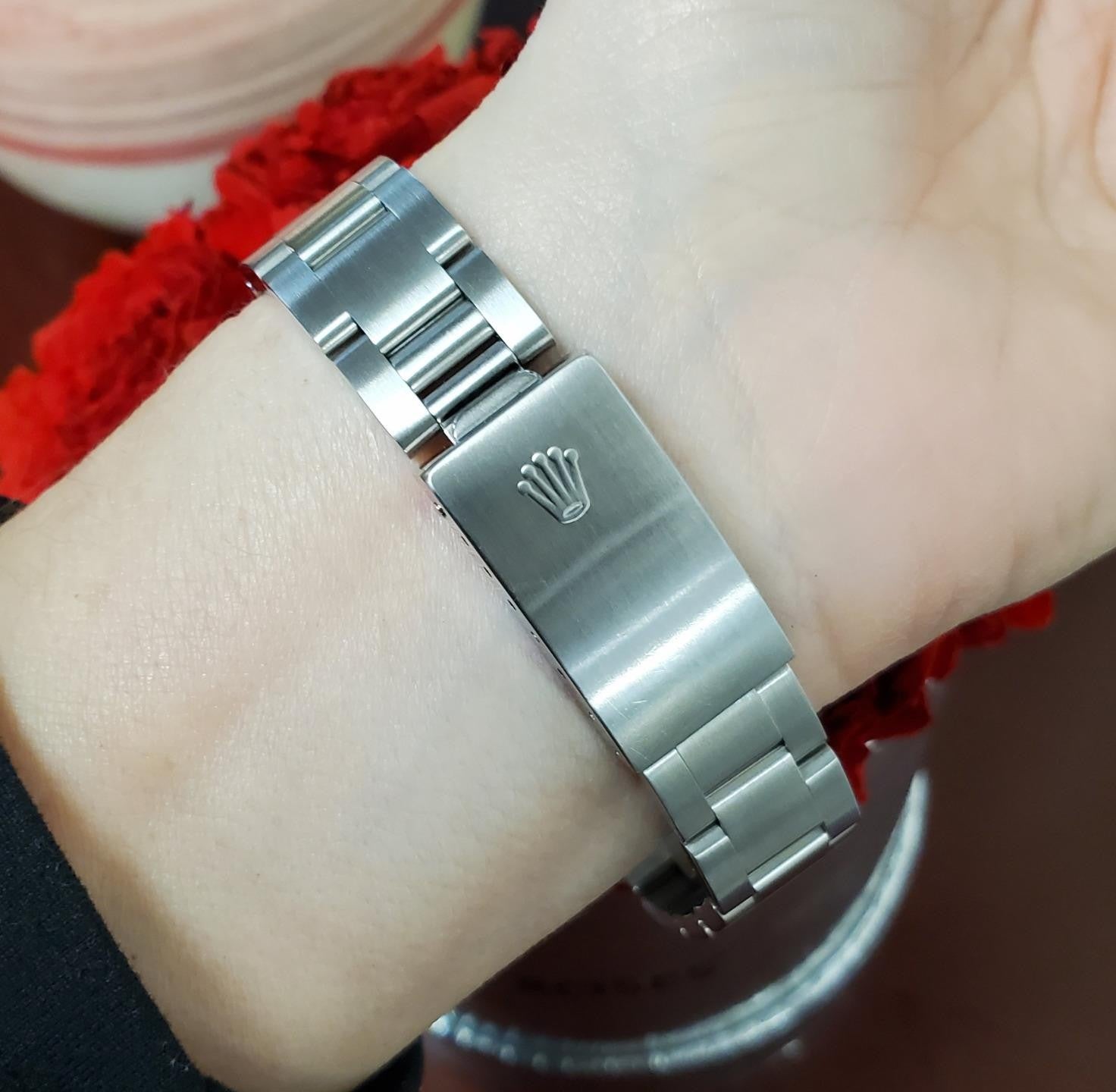 The Oyster bracelet measures approximately 7 3/4 inches in length and can be resized to ensure a proper fit. This example carries an “X” serial number, dating production to approximately 1991. The watch is in excellent pre-owned condition with no major flaws or defects and has been well cared for.