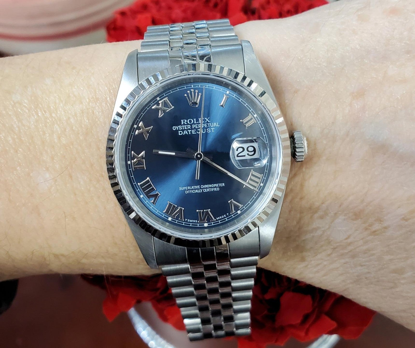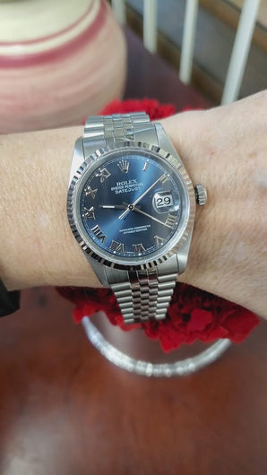 This 36mm Rolex Datejust stainless steel Jubilee model 16234 is a timeless classic, manufactured in 1996 and highly regarded for its balanced proportions and enduring design. The watch features a scratch-resistant sapphire crystal, an elegant 18k white gold fluted bezel, and a rich blue Roman numeral dial that adds depth and character while remaining easy to read.
