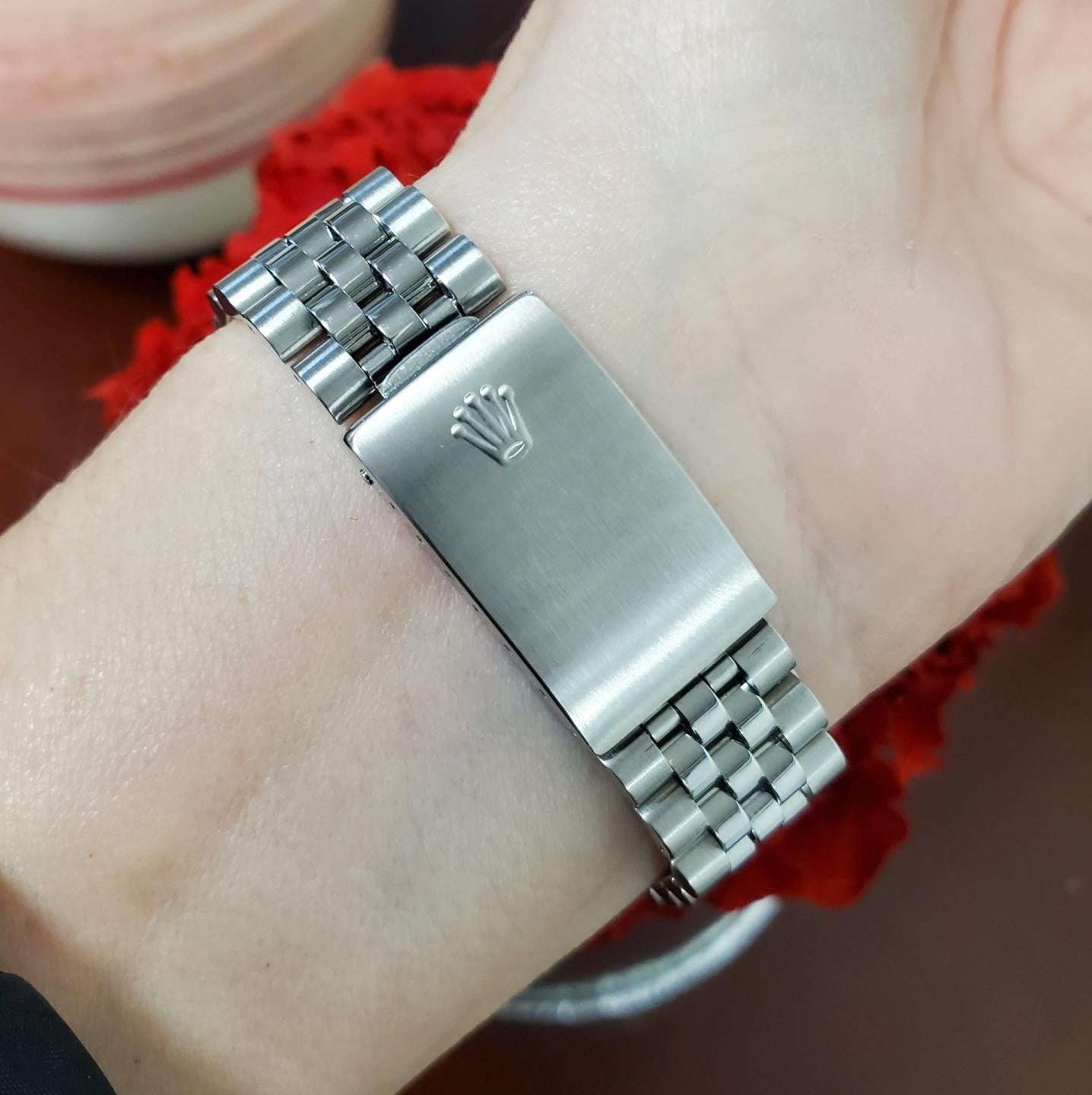 Powered by a Rolex automatic movement, the watch runs smoothly and keeps accurate time. The Jubilee bracelet fits approximately a 7 1/2 inch wrist and shows only light surface wear consistent with age. The case remains sharp, and the original serial number sticker is still intact on the caseback, a desirable detail for collectors and an indicator of careful ownership.
