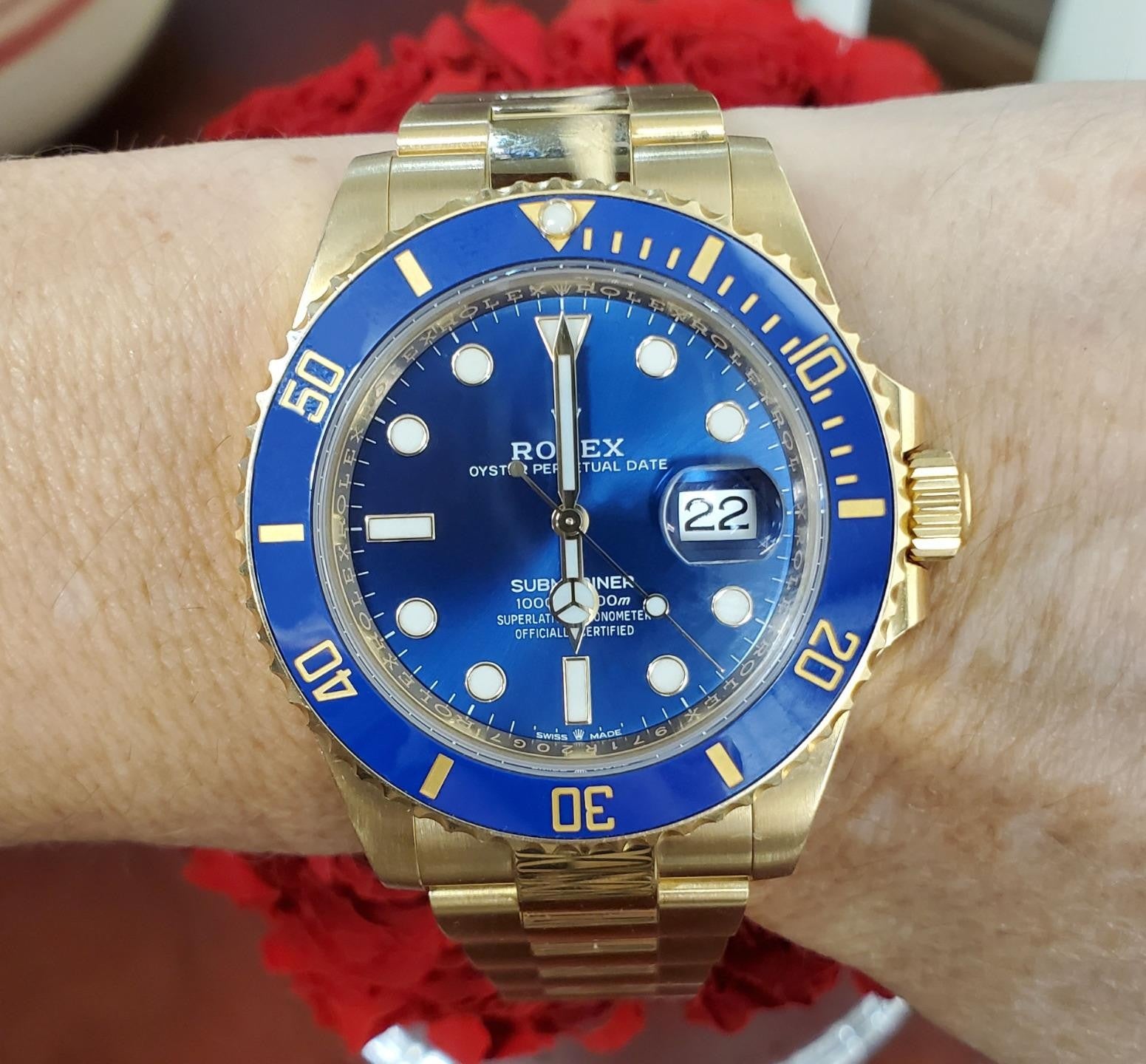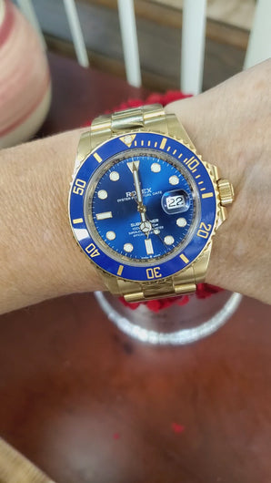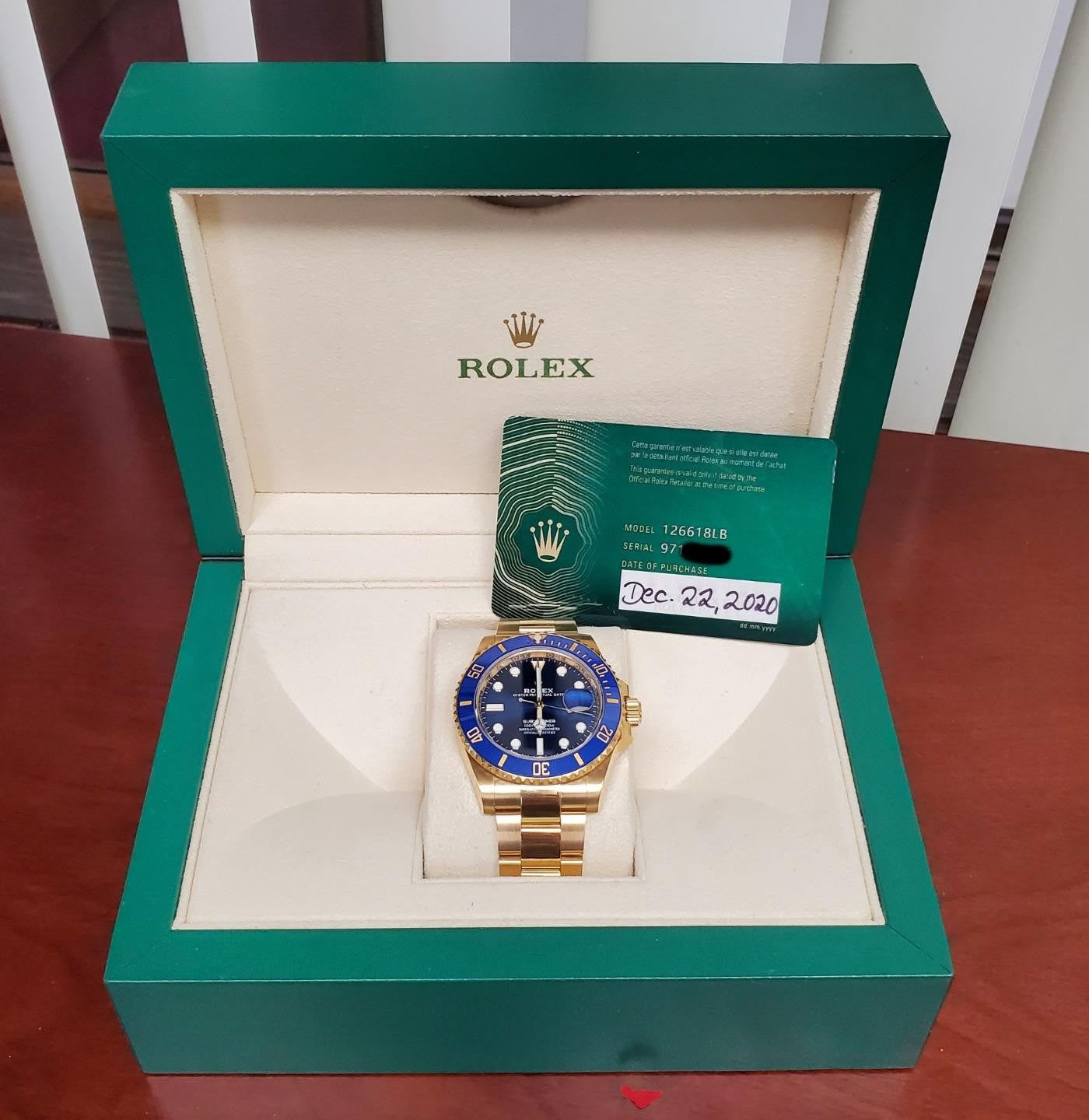 This 41mm Rolex Submariner, reference 126618LB, is one of the most iconic and desirable modern Rolex dive watches, crafted entirely from solid 18k yellow gold. The watch features the striking sunburst blue dial paired with a matching blue Cerachrom ceramic bezel, a combination that has become instantly recognizable and highly sought after by collectors and enthusiasts alike. The engraved bezel insert offers superior scratch resistance and long-lasting color vibrancy, while the dial is accented with luminous markers and hands for exceptional legibility both on land and underwater.