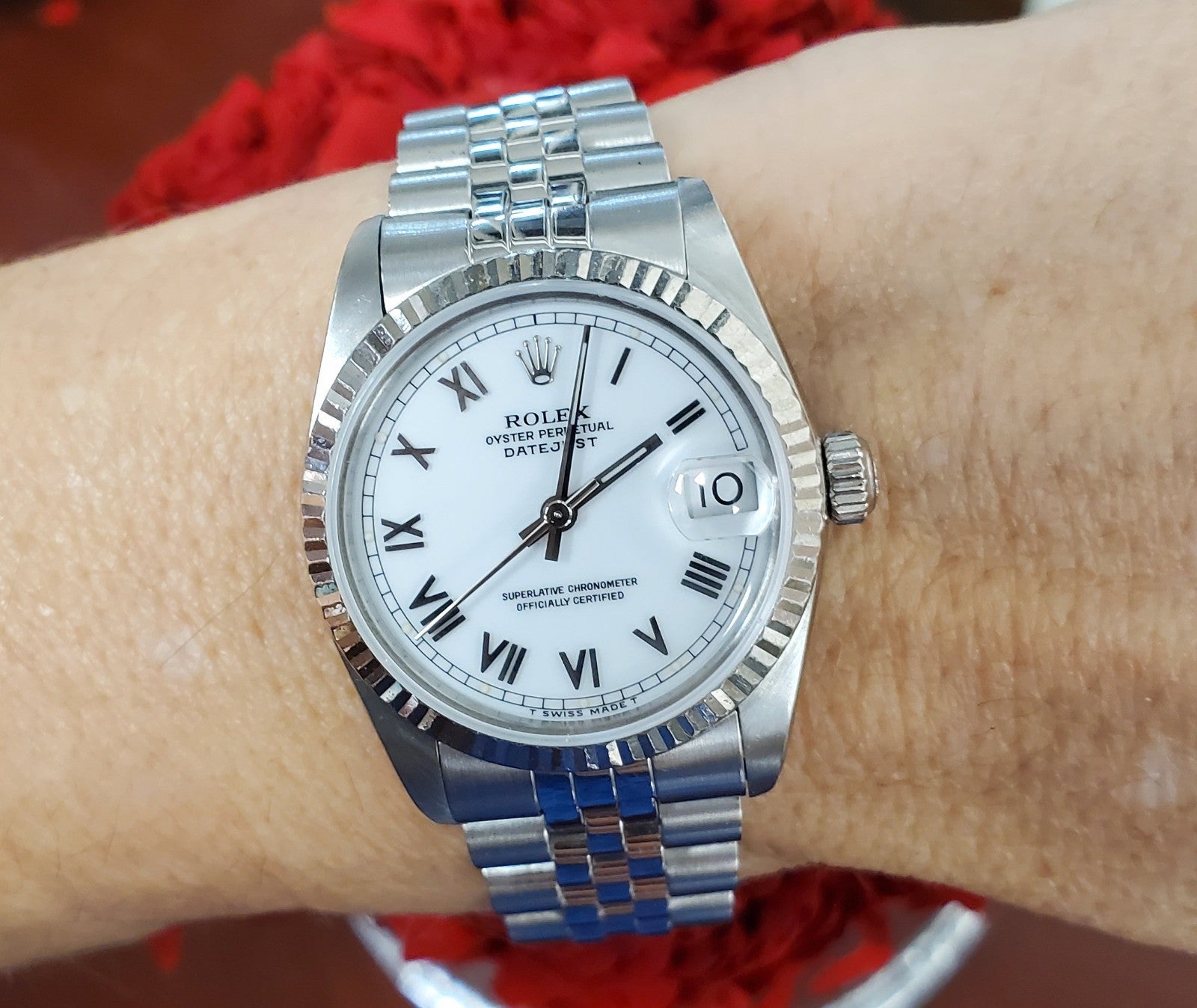 This 31mm Rolex Datejust, reference 68274, is a refined mid-size model that blends timeless elegance with reliable performance. Crafted from stainless steel and fitted with an 18k white gold fluted bezel, it embodies the understated luxury and classic proportions that make the Datejust an enduring favorite. The crisp white dial features Roman numeral hour markers and a date window at 3 o’clock beneath a sapphire crystal for added durability and clarity.