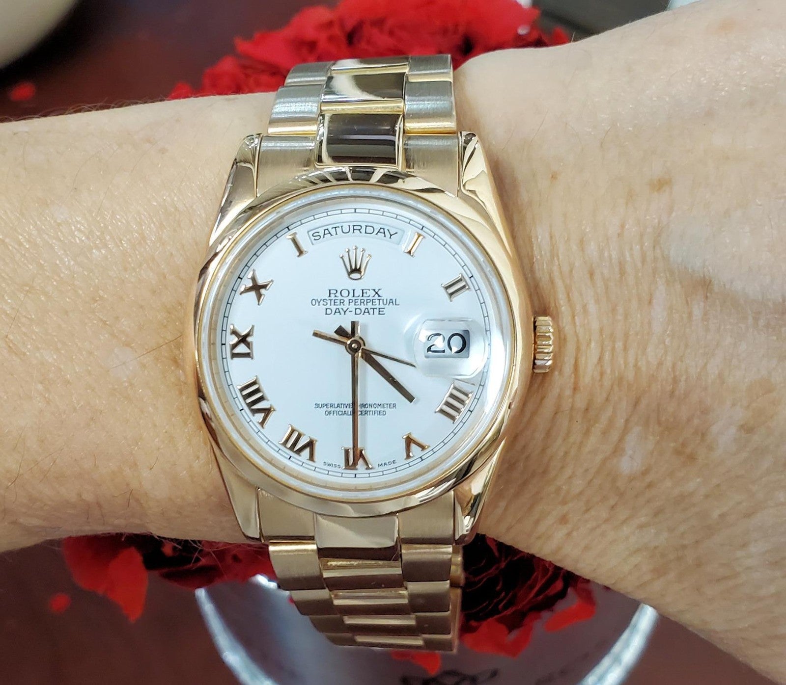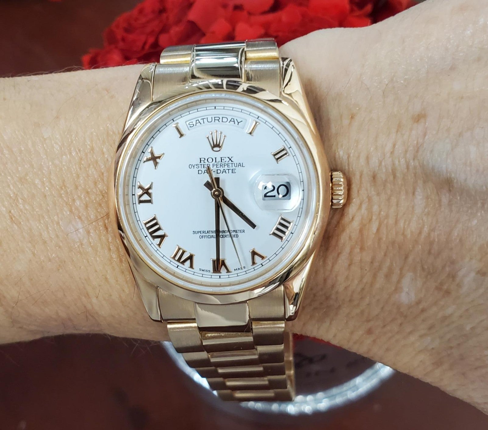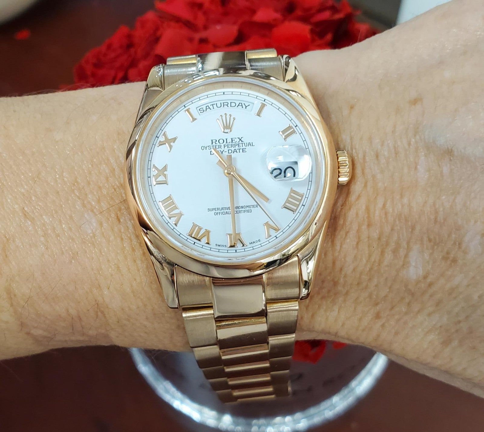 The crisp white dial provides excellent contrast against the rose gold Roman numerals and hands, giving the watch a refined and traditional appearance while maintaining strong legibility. Powered by Rolex’s precise automatic movement, the watch features the signature day display at 12 o’clock and date window at 3 o’clock beneath a sapphire crystal with Cyclops magnification.