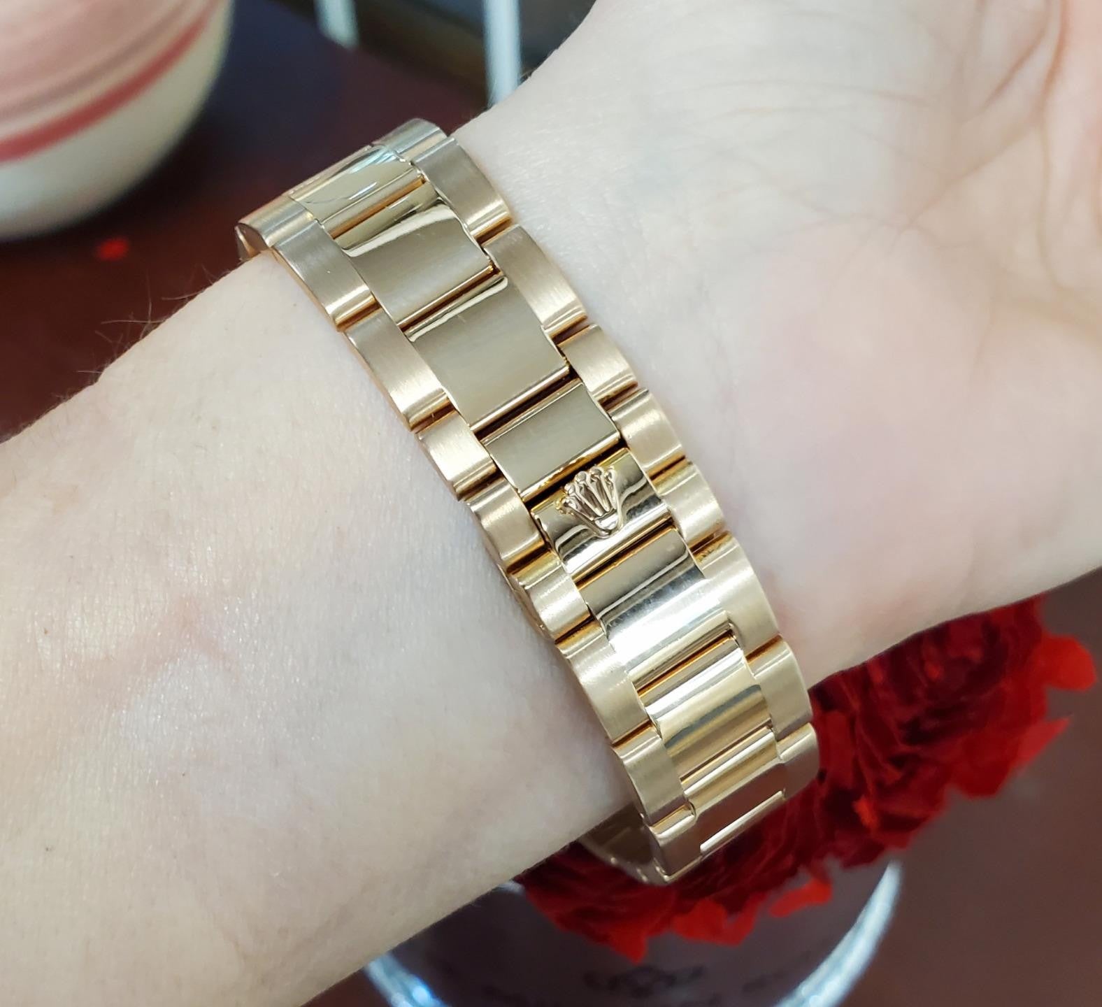 The solid 18k rose gold Oyster bracelet, measuring 8 inches in length, is tight and well-maintained, showing minimal stretch. The bracelet and case are in excellent condition overall, with only light marks from careful wear.