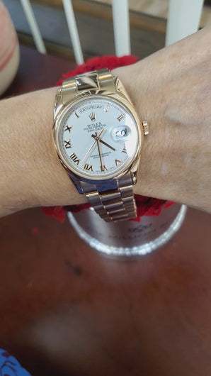 This 36mm Rolex Day-Date reference 118205 represents one of the most elegant and collectible variations of the iconic “President” line. Crafted entirely from solid 18k rose gold, it offers a perfect balance of understated luxury and timeless design. The polished and brushed finishes transition smoothly across the case and Oyster bracelet, reflecting the warmth and depth of the precious metal. Its fluted bezel and smooth curves capture light beautifully, enhancing the classic proportions that have defined the Day-Date since its debut.