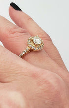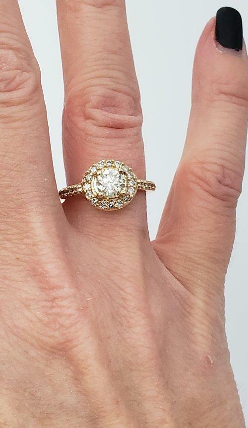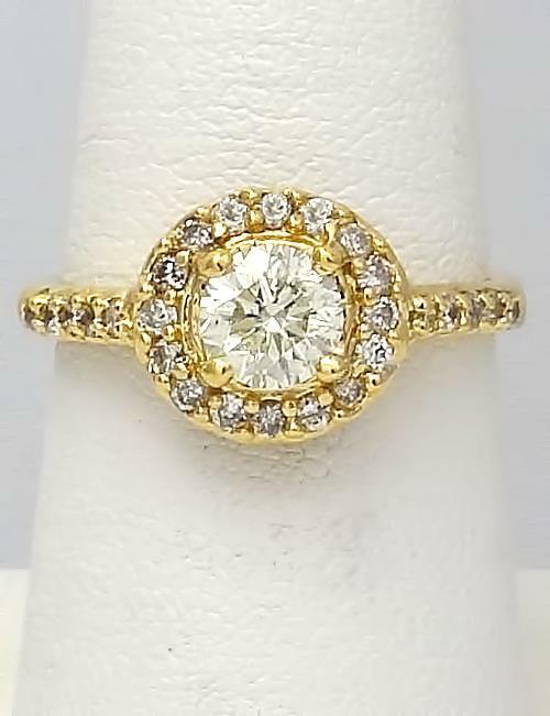 18k Yellow Gold 1.00ct Round Diamond Halo Engagement Ring! All she ever dreamed of, this beautiful diamond engagement ring is a wonderful reminder of your love. Crafted in 18K yellow gold, this splendid design showcases a sparkling .72 ct. diamond wrapped in a diamond frame. Additional diamonds shimmer along the shank. Dazzling with 1 ct. t.w. of diamonds and a bright polished shine, this engagement ring complements her unique style - today and always. Will come nicely boxed ready to give.