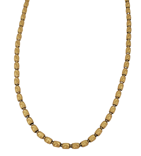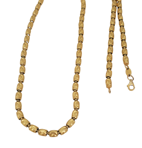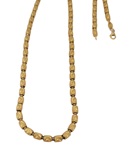 Enhance your style with this exquisite 10k Yellow Gold Italian Fancy Diamond Cut Barrel Link Chain Necklace. Crafted in Italy, this chain features a unique barrel link design with intricate diamond cuts, adding a touch of elegance. The necklace is 24 1/2 inches in length, secured with a lobster clasp, and comes beautifully packaged in a gift box.