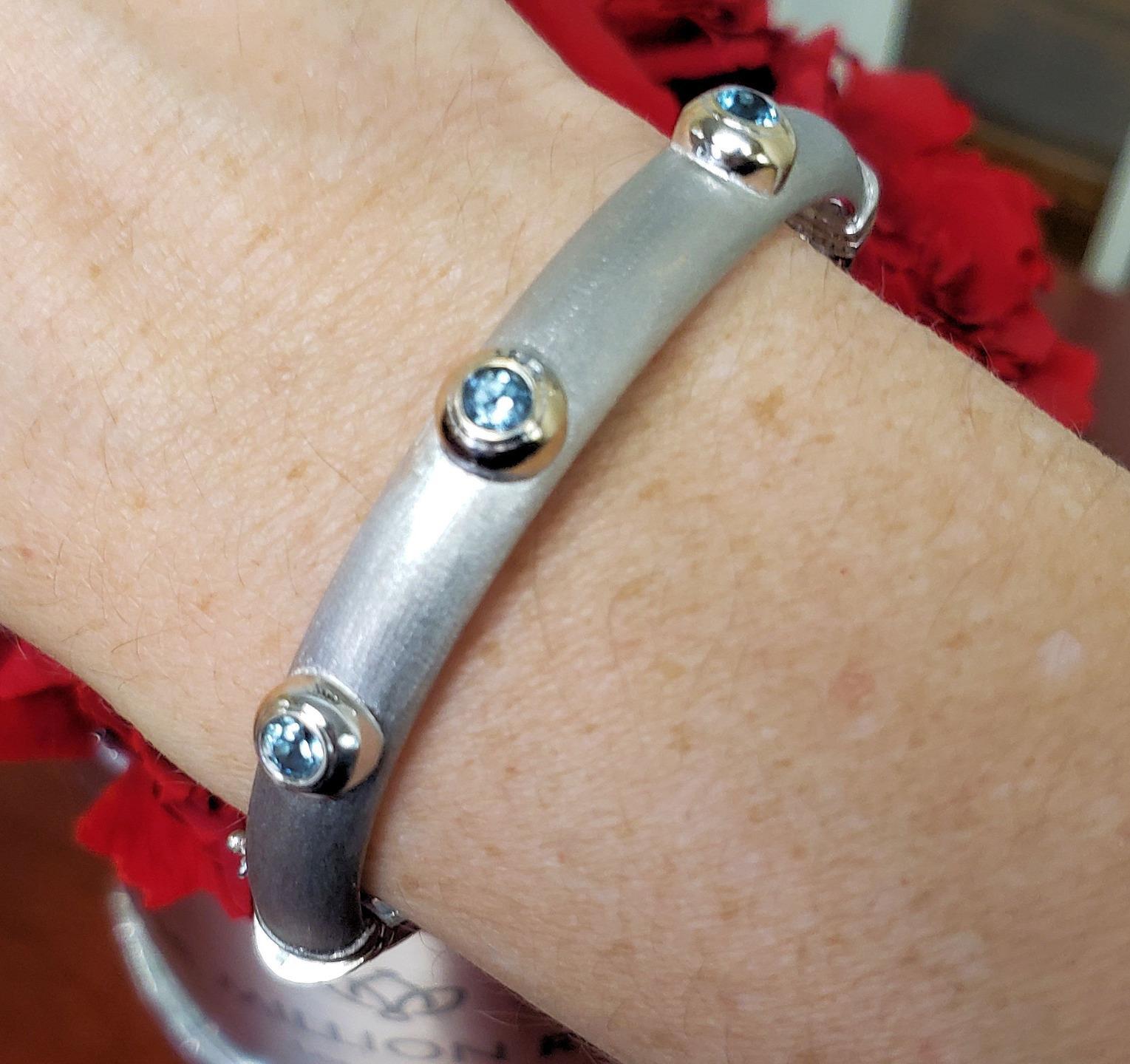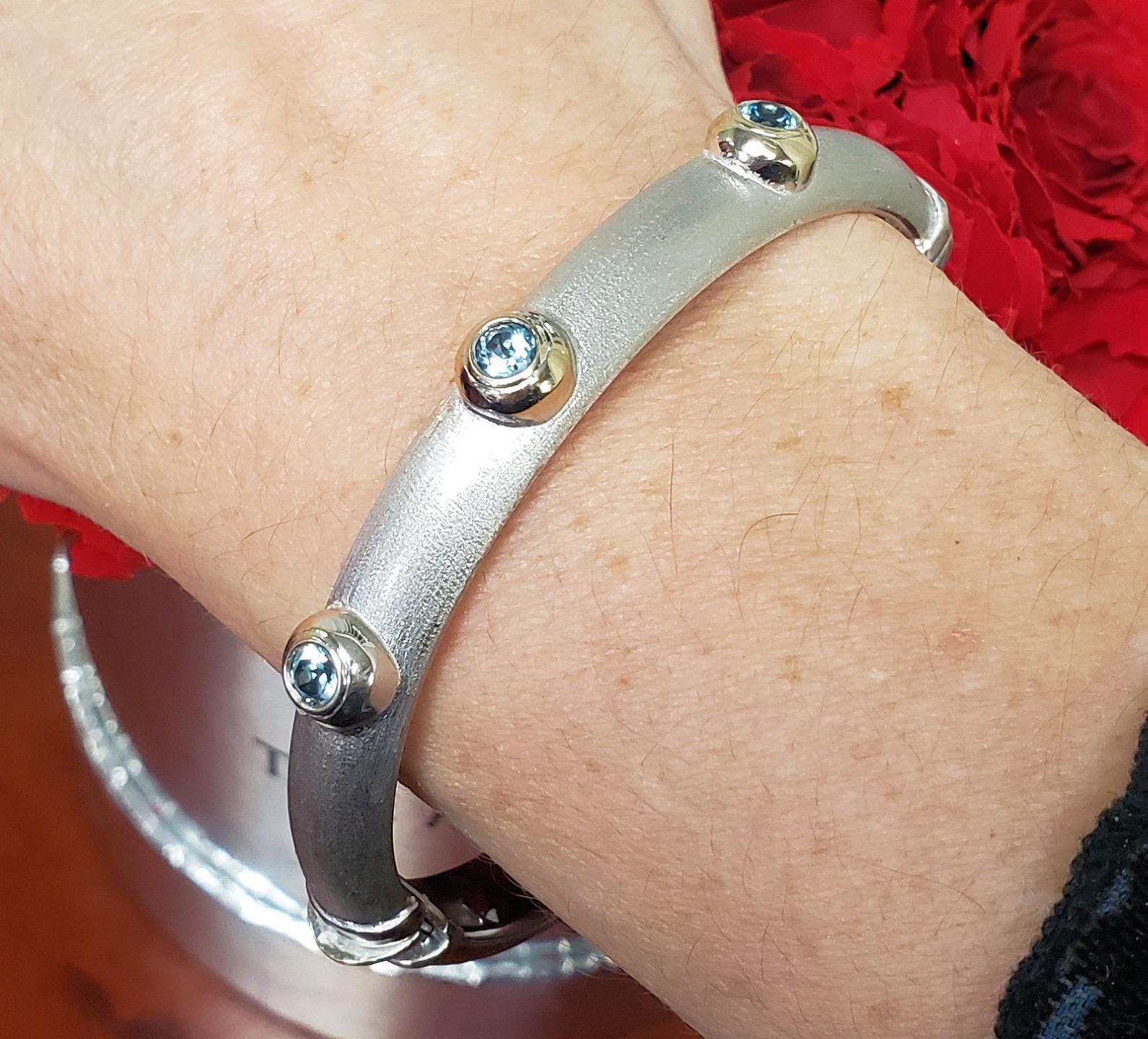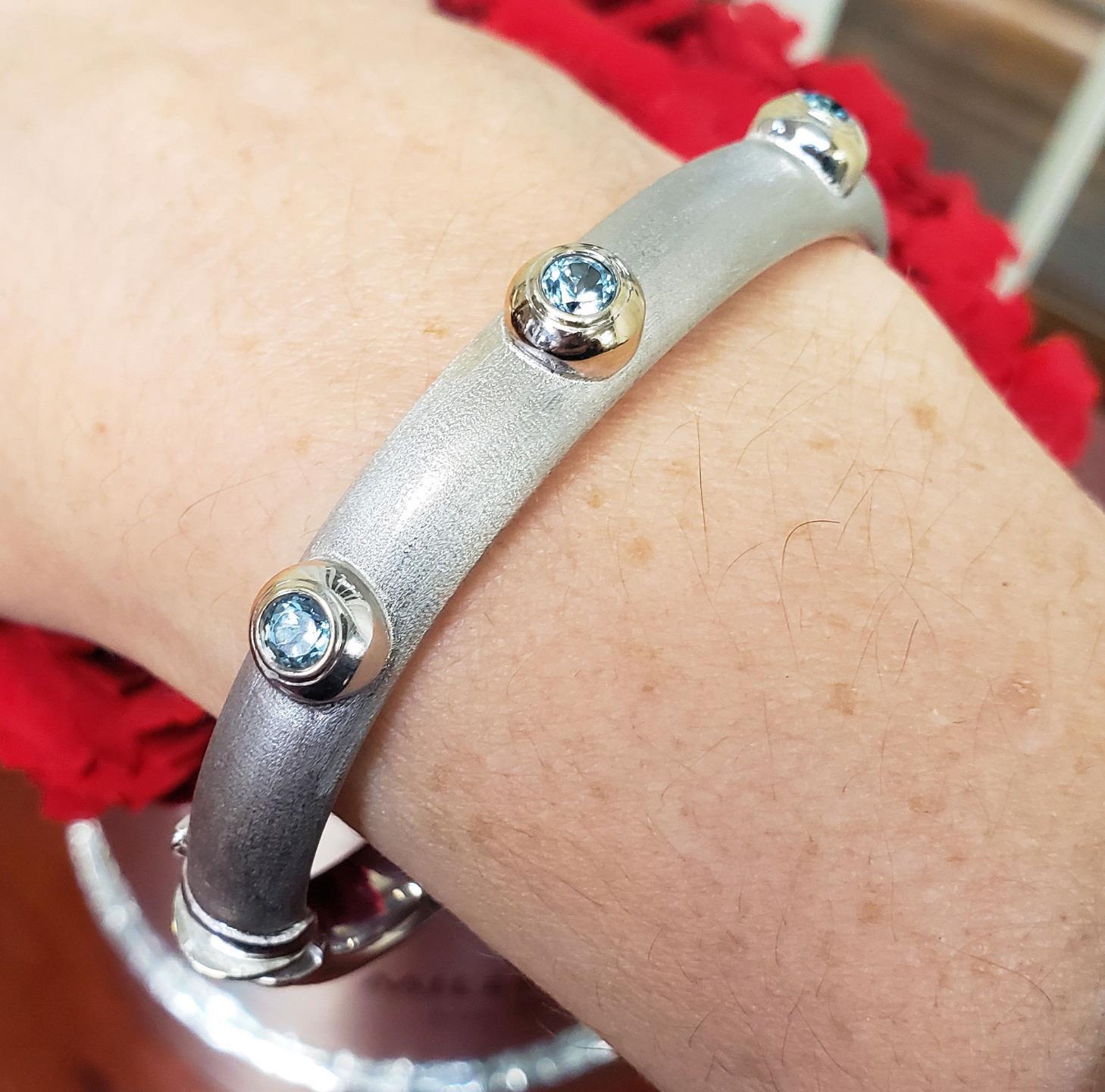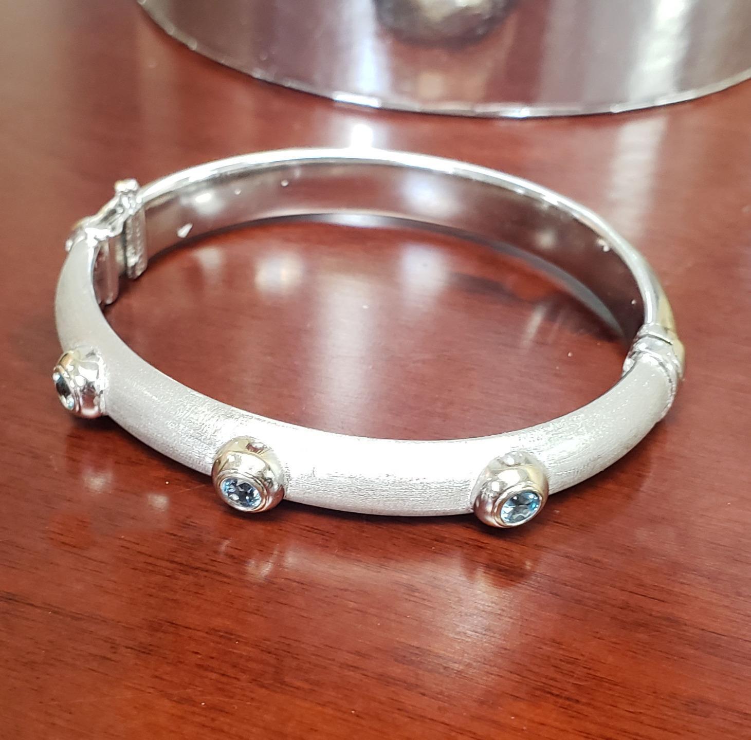The upper part of the bangle showcases a lustrous satin finish, imparting a subtle yet sophisticated texture that enhances the beauty of the blue topaz stones. Contrastingly, the lower part gleams with a high-polished finish, creating a striking visual appeal and adding a touch of brilliance to the design.