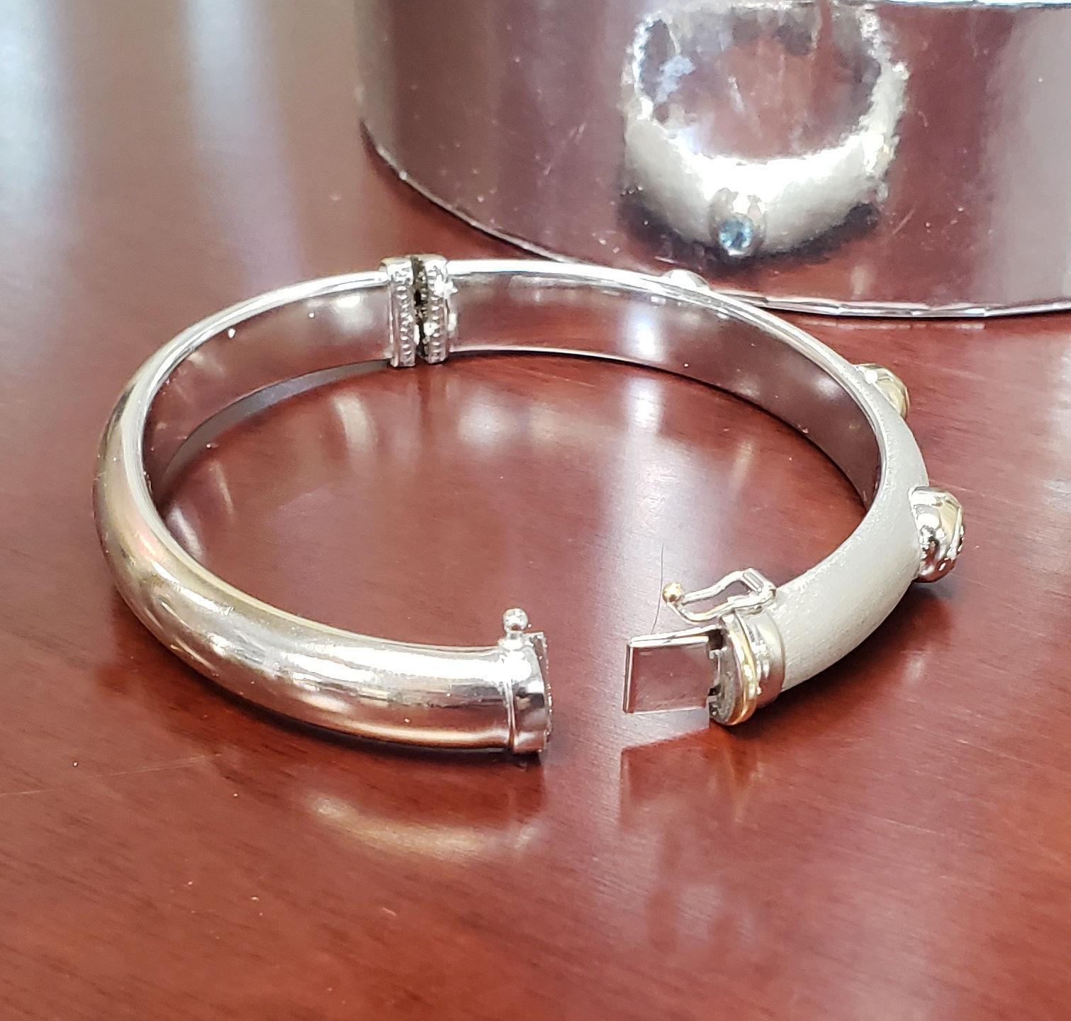 Crafted from premium 18k white gold, this bangle boasts a substantial weight of 24.1 grams, ensuring both durability and a luxurious feel on the wrist. Its dimensions of 8.6mm in width and 7.7mm in height provide a harmonious balance of presence and grace. Plus, with its 7" size, it's the perfect fit for any occasion, adding a touch of glamour to your ensemble effortlessly.