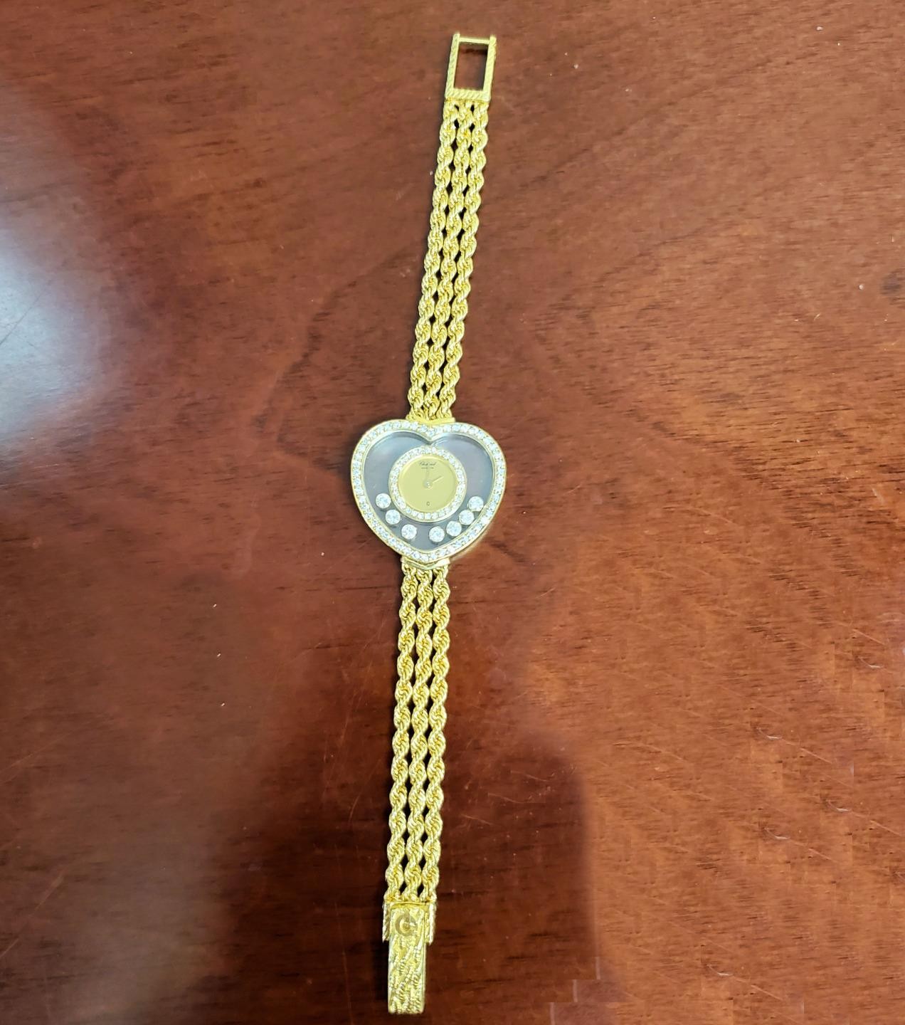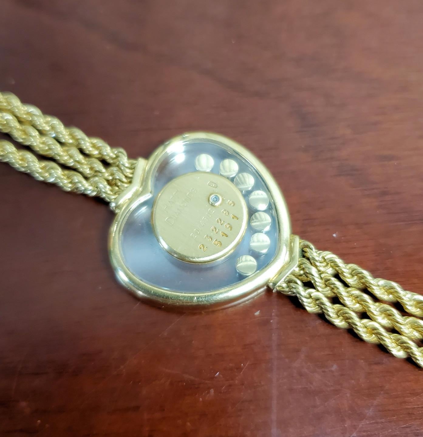 Chopard Happy Diamonds Heart 5191 Ladies Watch in solid 18k yellow gold. Features a heart-shaped case with the iconic Chopard floating diamonds housed between two sapphire crystals, creating a playful and elegant sparkle with every movement. The watch is fitted with a luxurious 3-row 18k yellow gold bracelet, offering a refined and timeless look. The watch adjusts from 6" - 6 1/4".